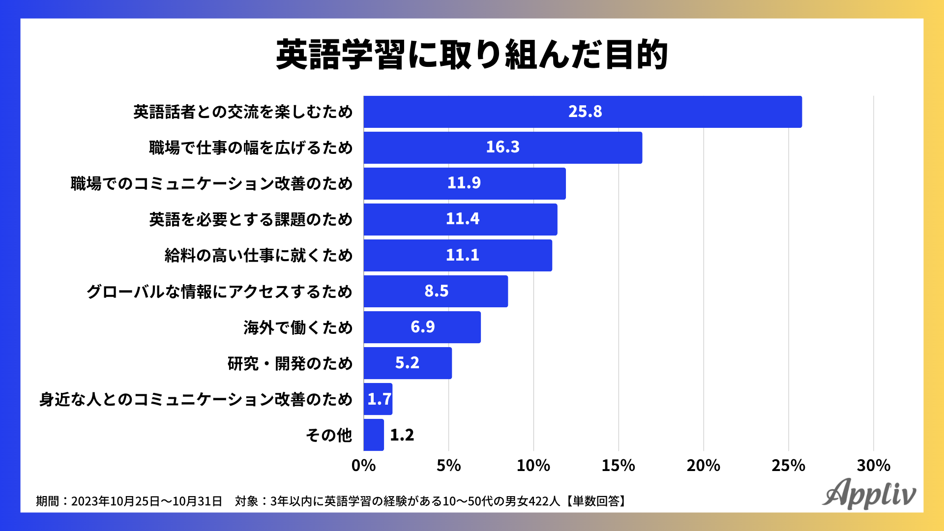 3年以内に英語学習に取り組んだ経験のある社会人422人に、その目的を調査したところ、最多は「英語話者との交流を楽しむため(25.8%)」でした。