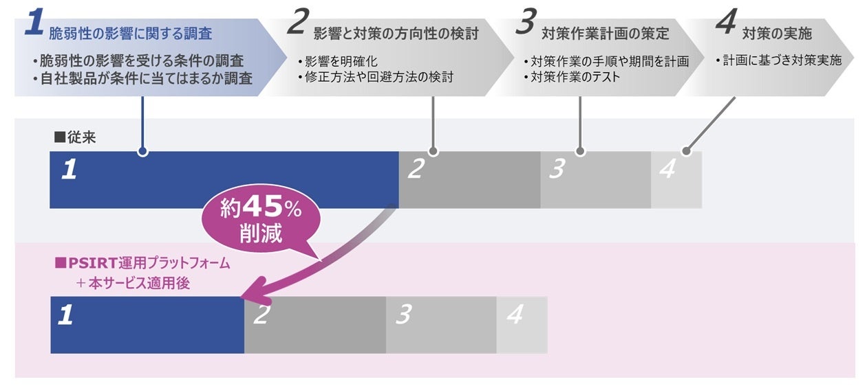 本サービスの活用により、従来時間がかかっていた人手による脆弱性の影響を受ける条件の整理が不要となり、調査にかかる時間を、約45%削減*6できます。チェックリストは自動で生成されるため、製品担当者の知見に左右されない調査ができ、脆弱性対処の品質向上も可能です。