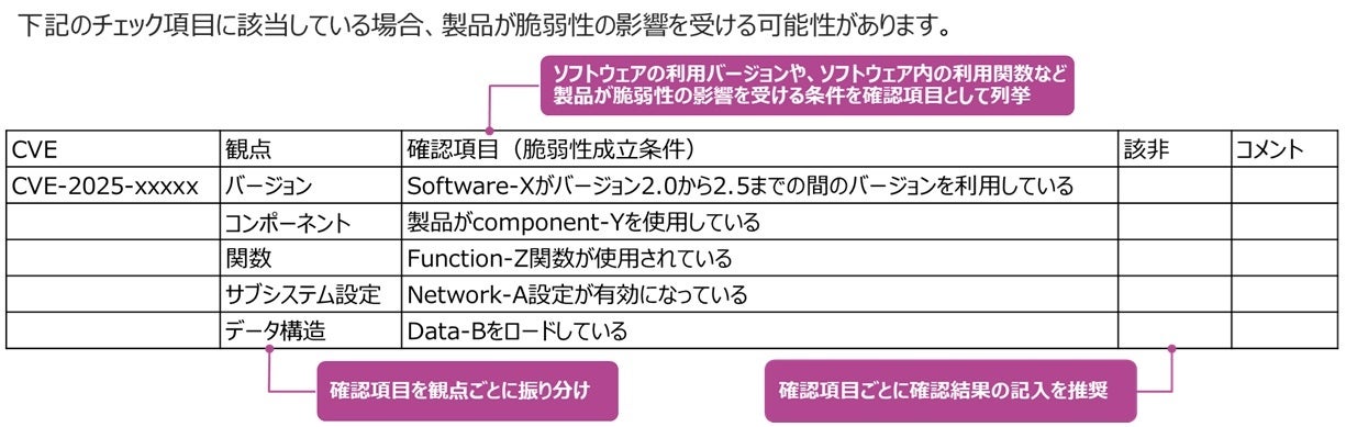 チェックリストを活用することで、脆弱性の影響に関する調査の抜け漏れを防止し、セキュリティの知見が少ない人でも知見がある人と同等の品質での調査が可能となります。これにより、知見や人財が不足している組織でも脆弱性対処の品質の向上が図れます。また、チェックリストは調査を網羅的に行っていることを示すエビデンスとしても活用できます。