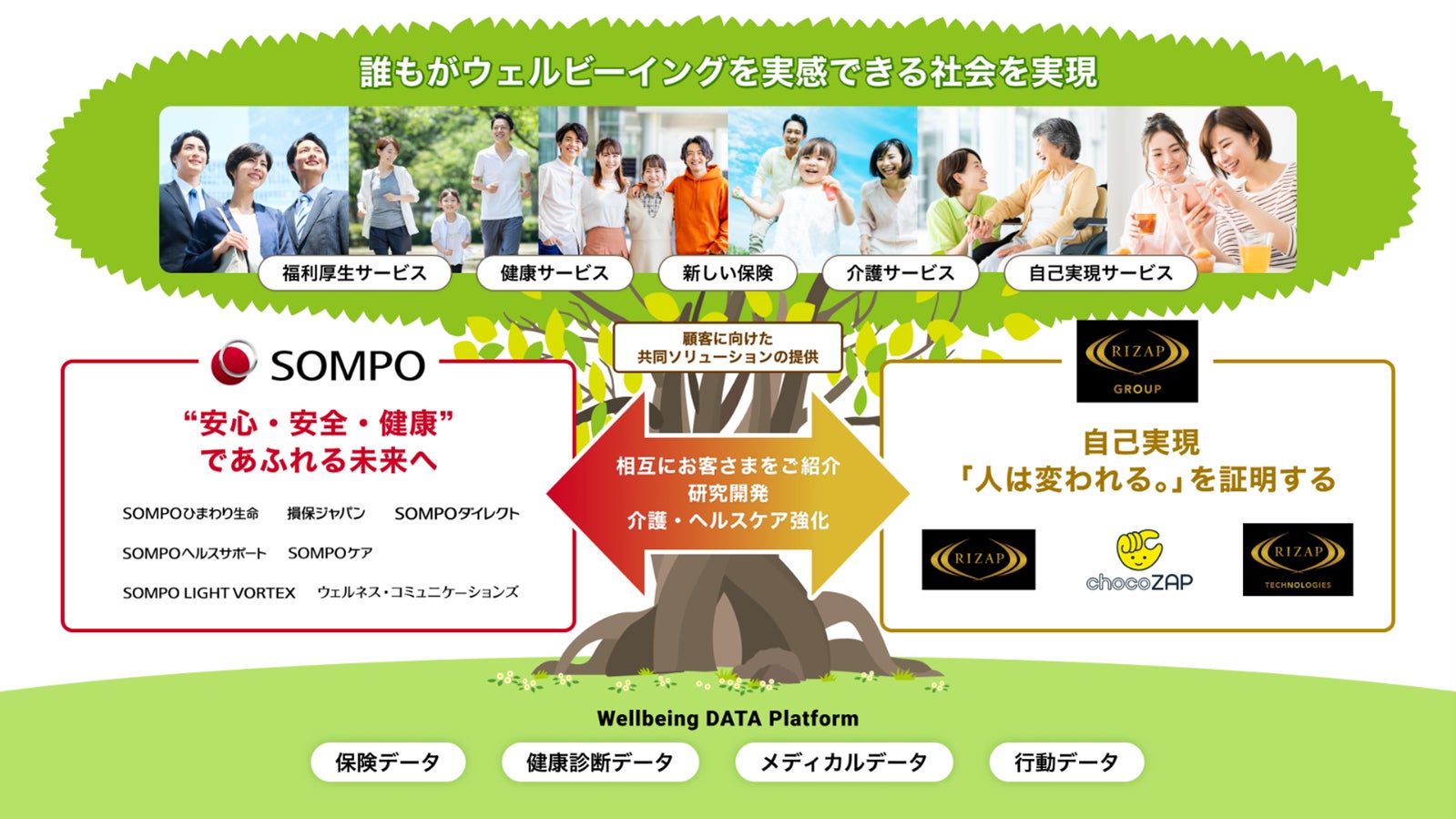 SOMPOホールディングスは保険・介護事業等を通じて培った強固な顧客基盤・販売網を有し、安心・安全・健康に資する保険商品やサービスをグループで提供しています。また、RIZAPグループは健康増進ソリューションを強みにフィットネスや医療連携サービスを提供しています。