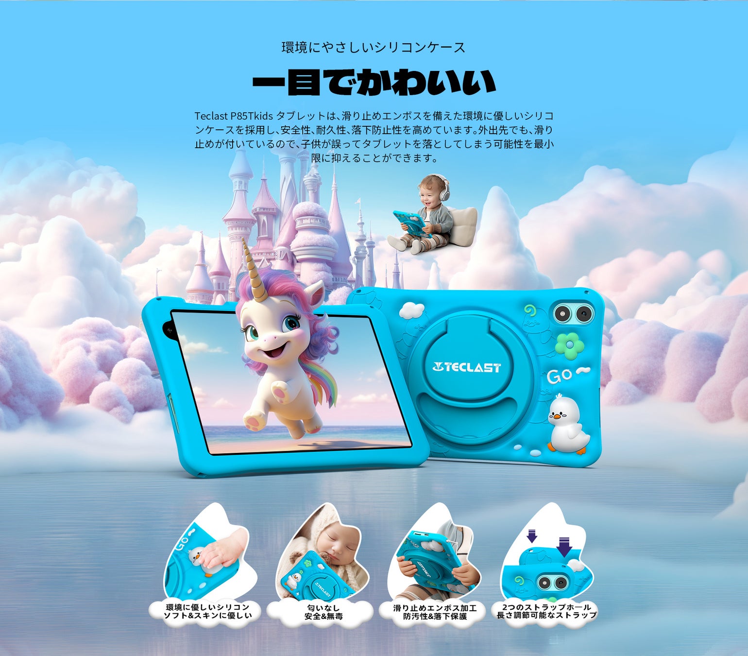 Teclast P85Tkidsタブレットは、滑り止めエンボスを備えた環境に優しいシリコンケースを採用し、安全性、耐久性、落下防止性を高めています。外出先でも、滑り止めが付いているので、子供が誤ってタブレットを落としてしまう可能性を最小限に抑えることができます。