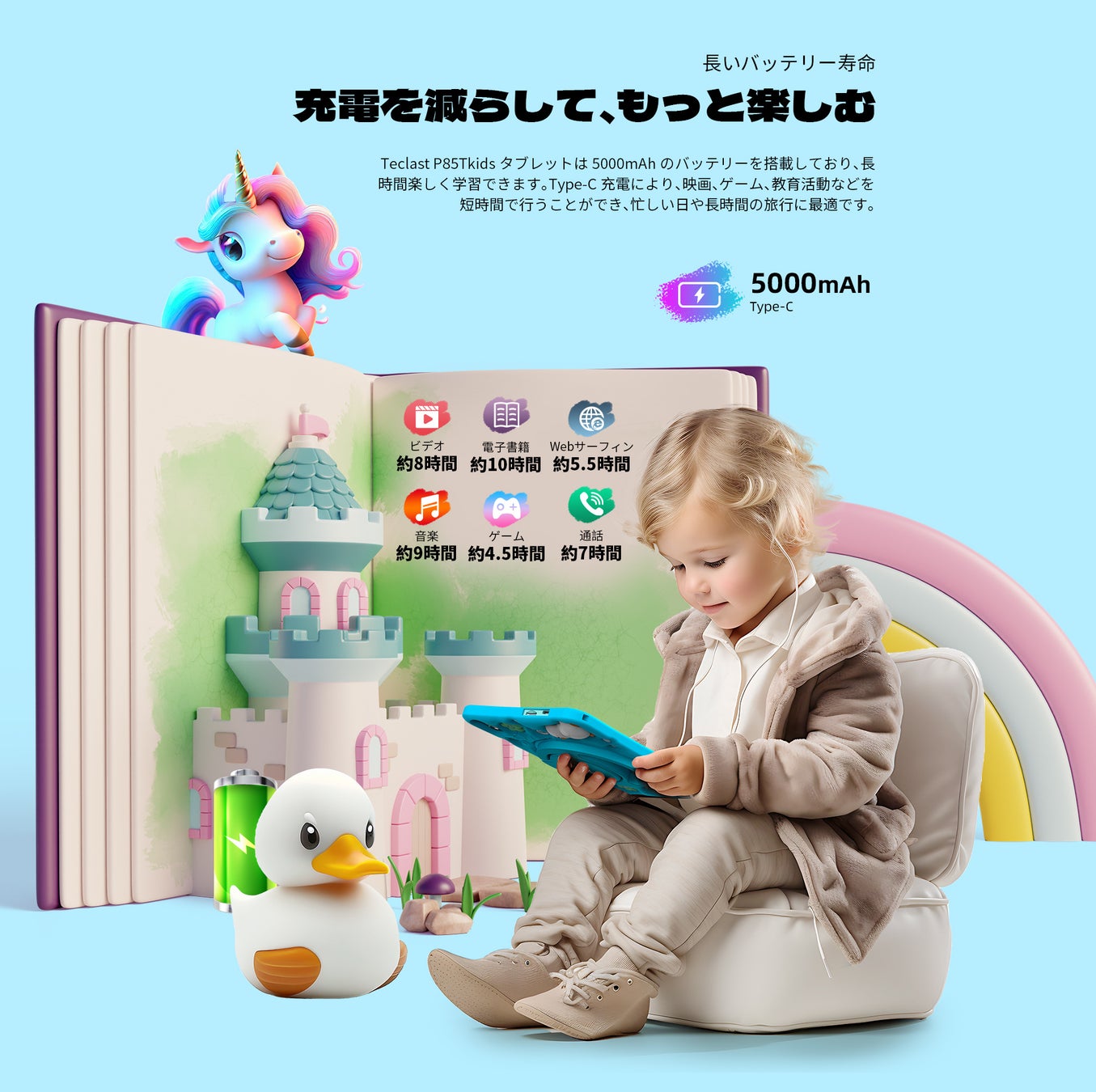Teclast P85Tkidsタブレットは5000mAhのバッテリーを搭載しており、長時間楽しく学習できます。Type-C充電により、映画、ゲーム、教育活動などを短時間で行うことができ、忙しい日や長時間の旅行に最適です。