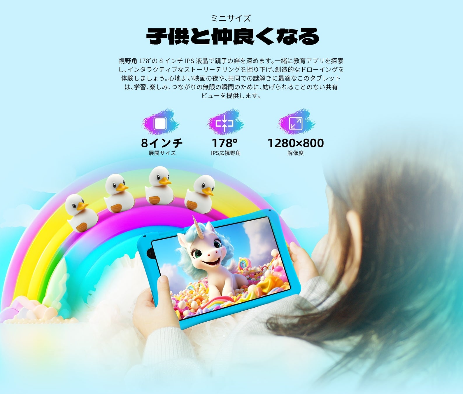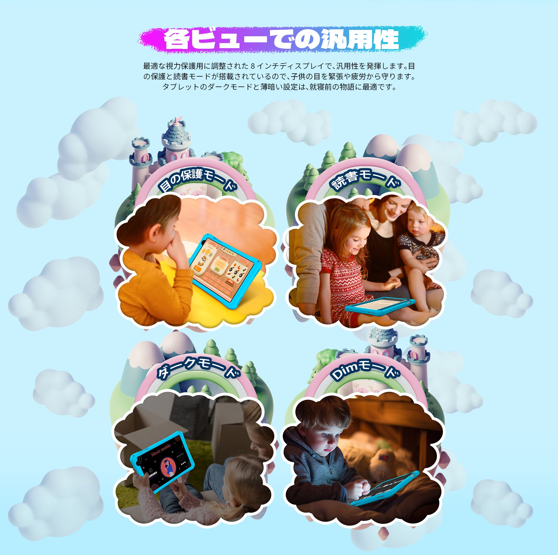 最適な視力保護用に調整された8インチディスプレイで、汎用性を発揮します。目の保護と読書モードが搭載されているので、子供の目を緊張や疲労から守ります。タブレットのダークモードと薄暗い設定は、就寝前の物語に最適です。