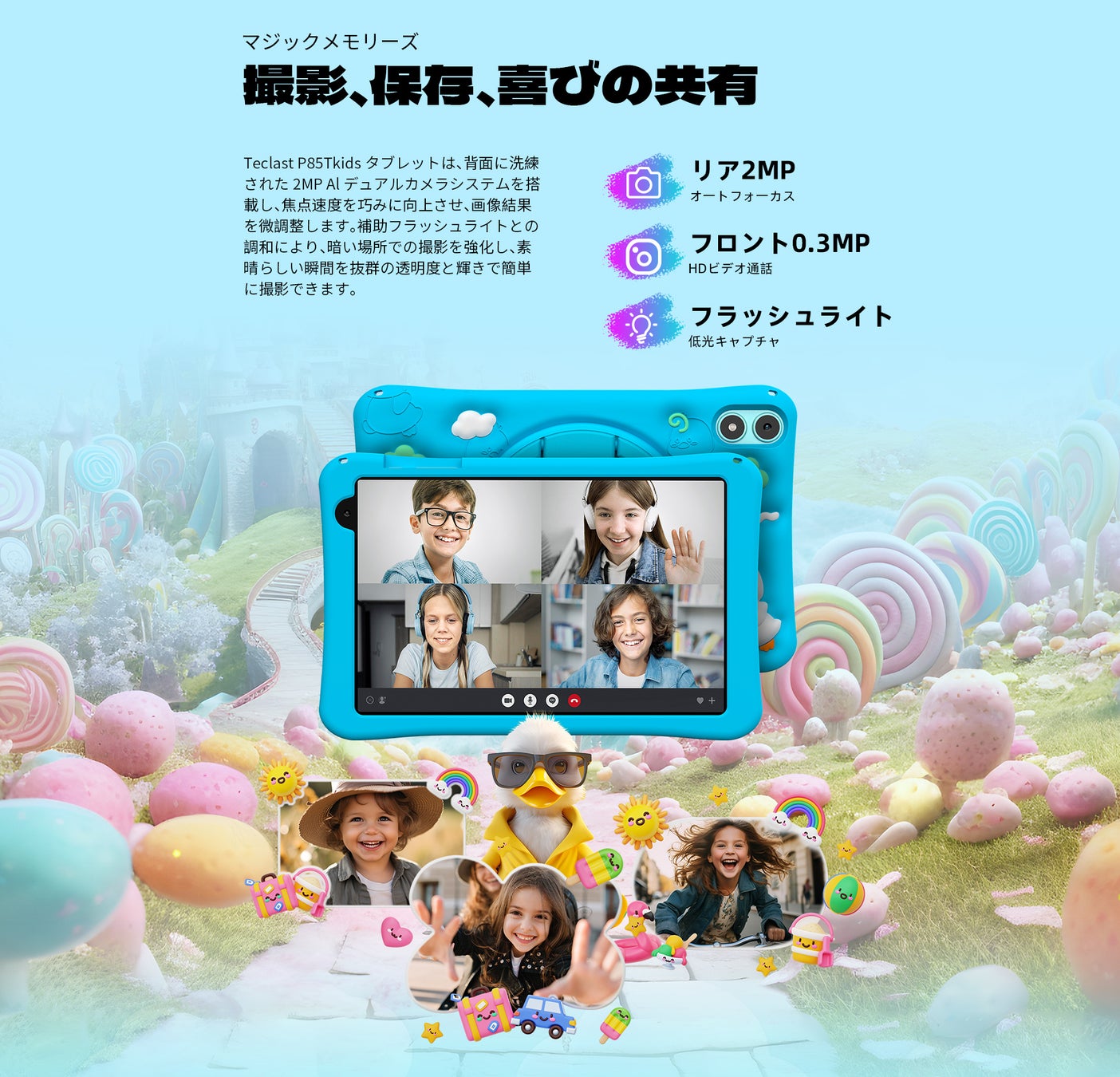 Teclast P85Tkidsタブレットは、背面に洗練された2MP Alデュアルカメラシステムを搭載し、焦点速度を巧みに向上させ、画像結果を微調整します。補助フラッシュライトとの調和により、暗い場所での撮影を強化し、素晴らしい瞬間を抜群の透明度と輝きで簡単に撮影できます。