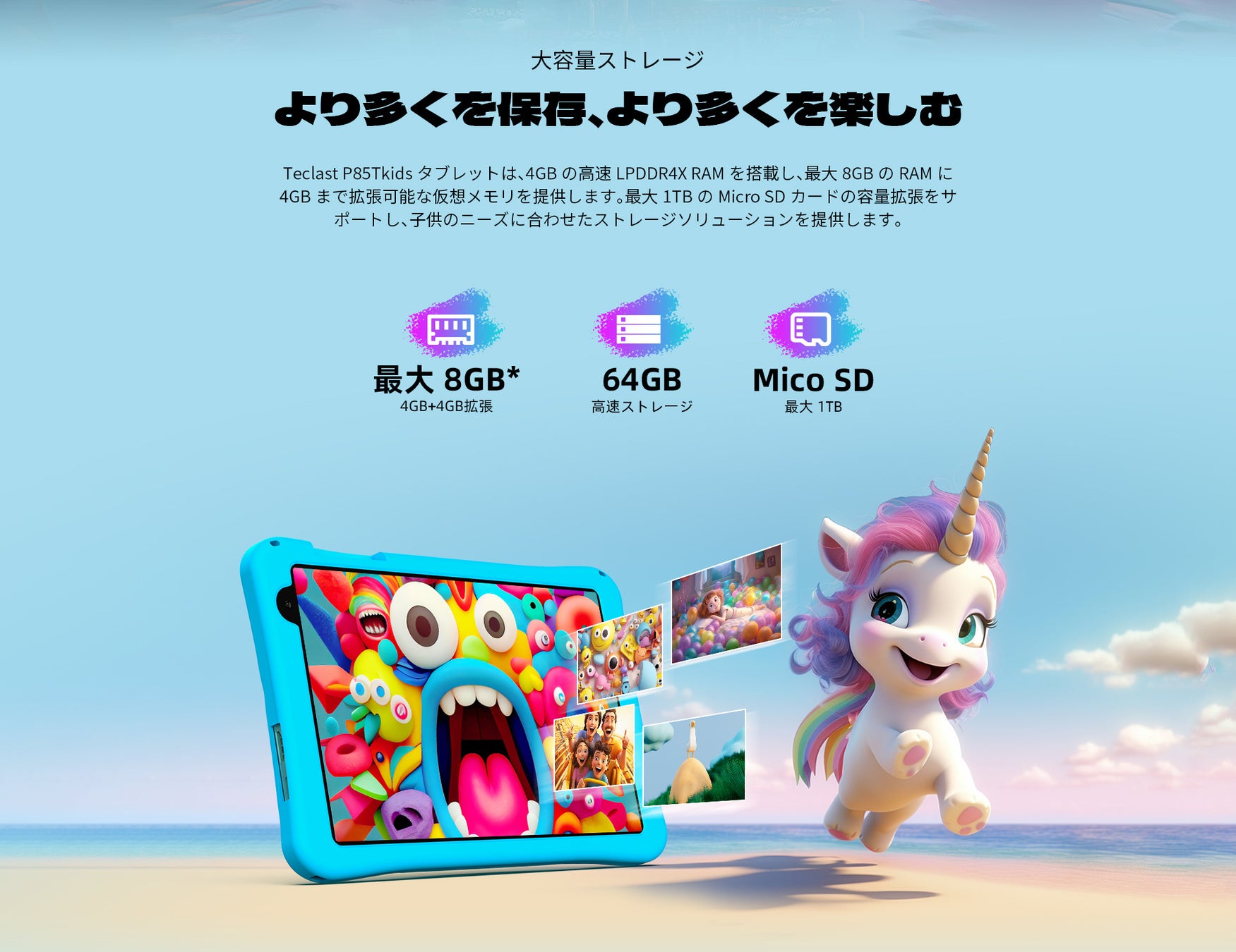 Teclast P85Tkidsタブレットは、4GBの高速LPDDR4X RAMを搭載し、最大8GBのRAMに4GBまで拡張可能な仮想メモリを提供します。最大1TBのMicro SDカードの容量拡張をサポートし、子供のニーズに合わせたストレージソリューションを提供します。