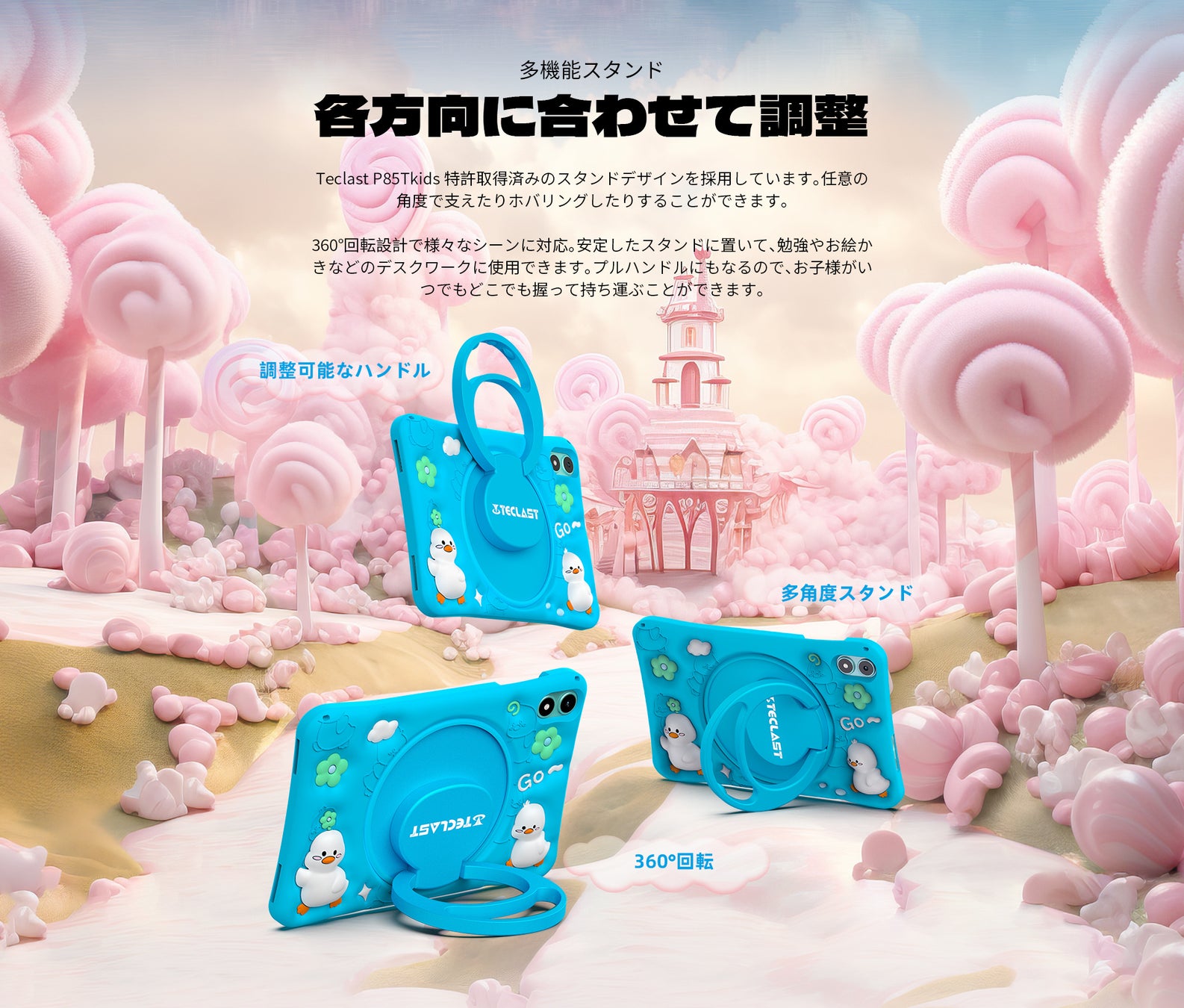 Teclast P85Tkids特許取得済みのスタンドデザインを採用します。任意の角度で支えたりホバリングしたりすることができます。360°回転設計で様々なシーンに対応。安定したスタンドに置いて、勉強やお絵かきなどのデスクワークに使用できます。プルハンドルにもなるので、子供がいつでもどこでも握って持ち運ぶことができます。