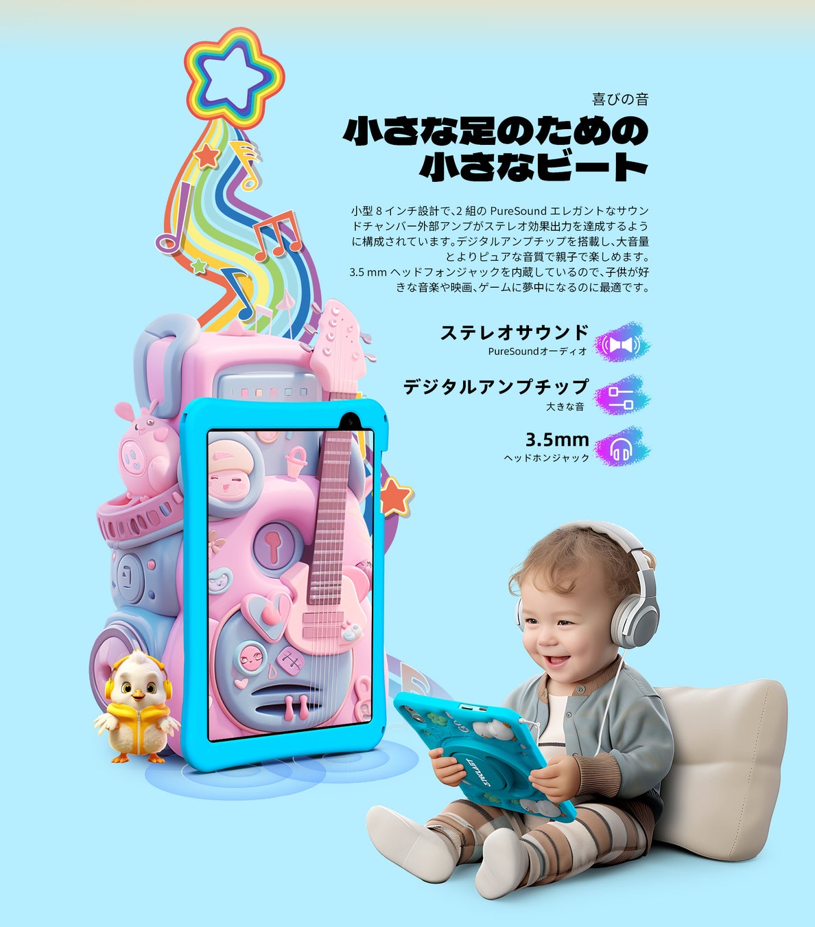 小型8インチ設計で、2組のPureSoundエレガントなサウンドチャンバー外部アンプがステレオ効果出力を達成するように構成されています。デジタルアンプチップを搭載し、大音量とよりピュアな音質で親子で楽しめます。3.5 mmヘッドフォンジャックを内蔵しているので、子供が好きな音楽や映画、ゲームに夢中になるのに最適です。