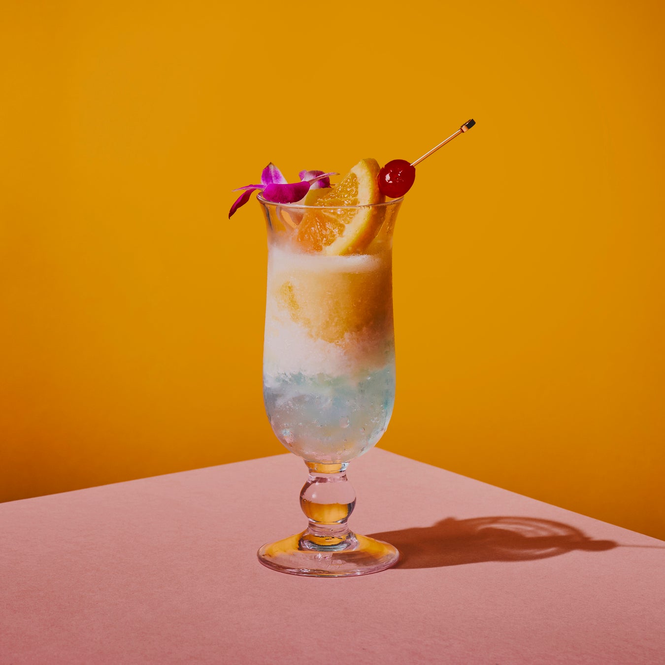 南国をイメージした、この季節だけのカクテルパフェ。ボトムには白ワインにブルーキュラソー、シロップ、レモンジュースを合わせたゼリーを配し、グラス中央にはパイナップルとウォッカのソルベを閉じ込めました。トップにはラムやココナッツシロップ、ミルクで仕上げたソルベをオン。層を混ぜ合わせると、ハワイで誕生したトロピカルカクテル「ブルーハワイ」に。ハワイの美しい海を想わせる華やかな装いのカクテルです。