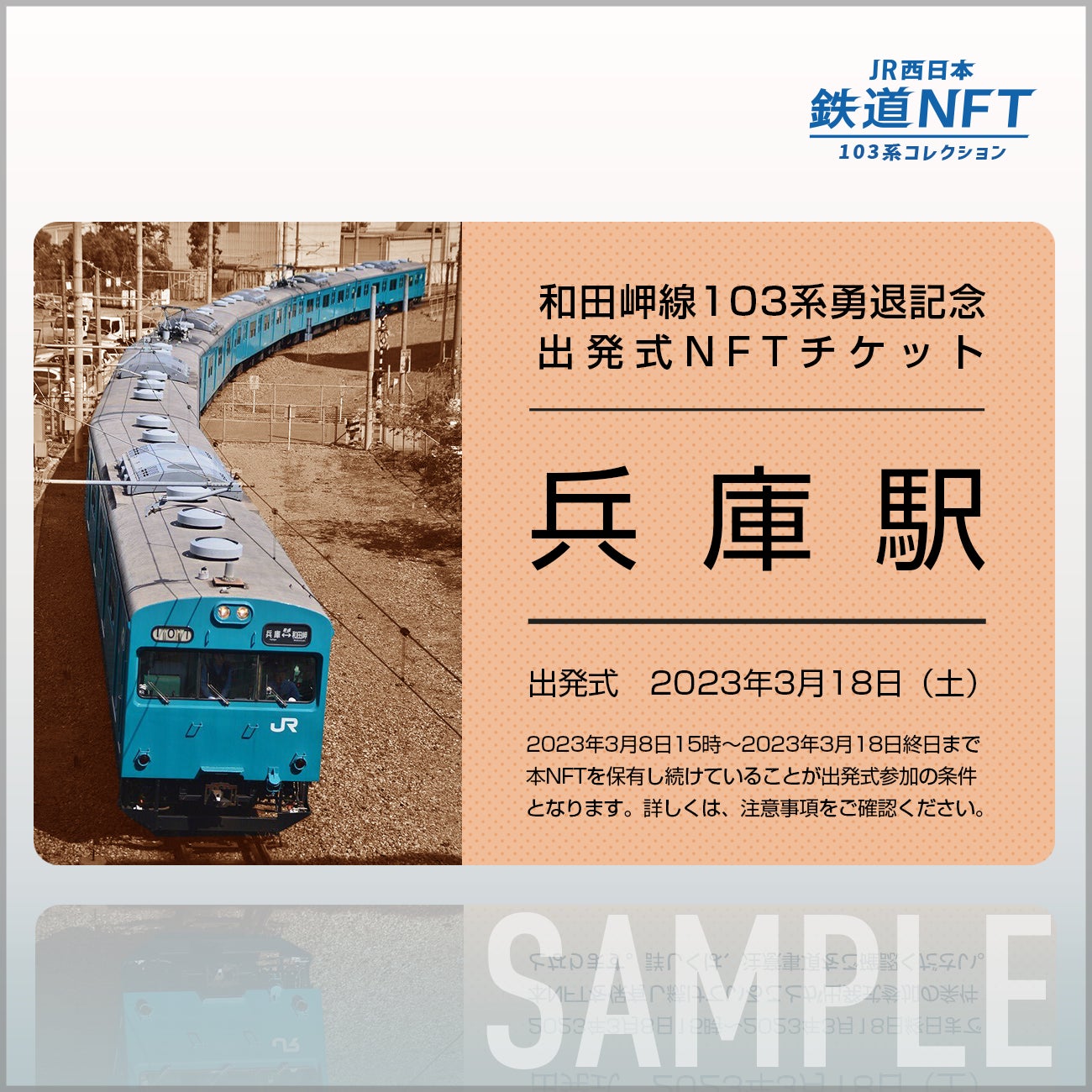 - 『和田岬線103系勇退記念出発式NFTチケット』は、2023年3月18日(土)に開催される和田岬線103系勇退記念出発式において兵庫駅長とともに列車を出発させる合図を出すことができるJR西日本ならではの“特別な体験”が受けられる権利が付与されたチケット型NFTです。貴重な未使用品の和田岬線「103系 側面字幕」(非売品)付きです。