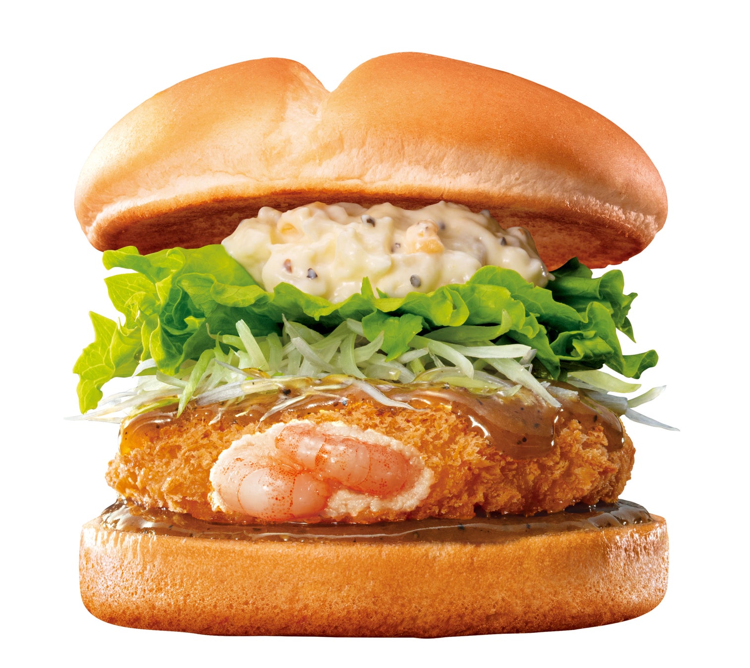 商品概要:プリプリ食感のエビを使用し、粗めに挽いたパン粉でサクサク食感に仕上げたエビパティに、レモン香る爽やかな塩だれを合わせ、特製タルタルソース、レタス、白髪ネギとともにふっくらなめらかな食感のバンズで挟みました。