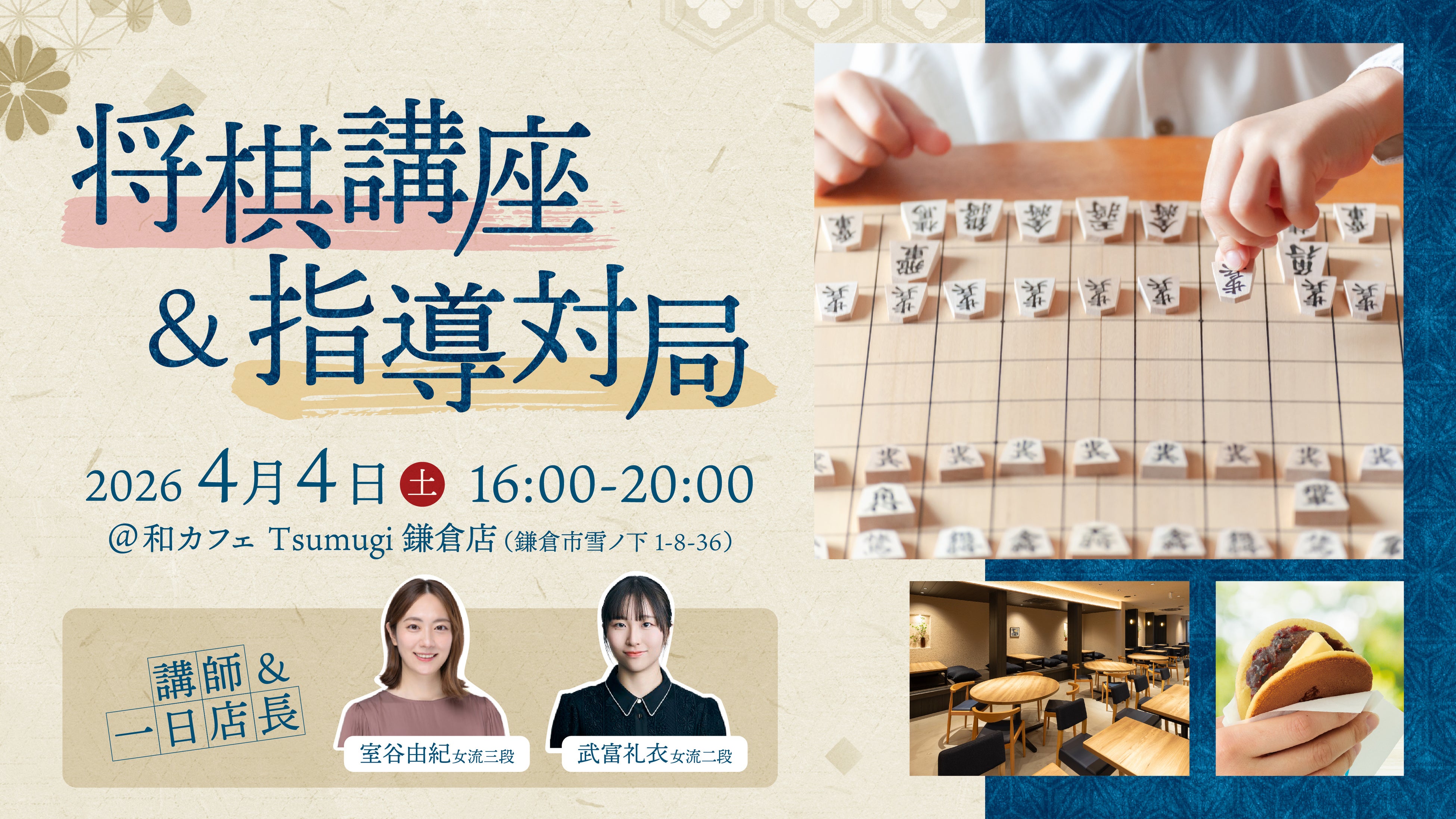 本イベントは、鎌倉・若宮大路沿いに位置する和カフェ Tsumugi 鎌倉店にて開催される、将棋の講座と指導対局を組み合わせた体験型イベントです。