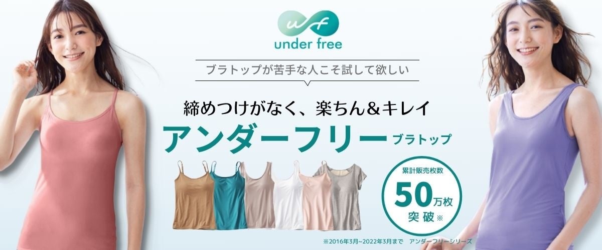 株式会社ニッセン(本社:京都市南区、代表取締役社長:羽渕 淳)が販売する、アンダーゴムなしで締めつけないブラトップ『under free(以下、アンダーフリー)』が販売を開始した2016年3月から2022年3月までで累計販売枚数50万枚を突破したことへの感謝の気持ちを込めて、キャンペーンを5月12日(木)AM11時より実施いたします。