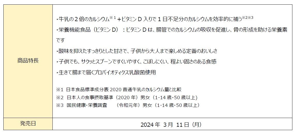 従来より3個パックには牛乳の2倍のカルシウム※を配合しており、お客さまから好評をいただいていたため、今回、125gの個食タイプでも牛乳の2倍のカルシウム※が取れるように配合を見直しました。