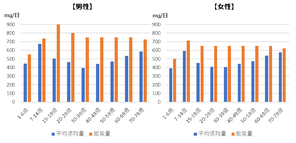 【出典】摂取量:厚生労働省 国民健康・栄養調査(平成30年)推奨量:日本人の食事摂取基準(2020年)を元に独自作成