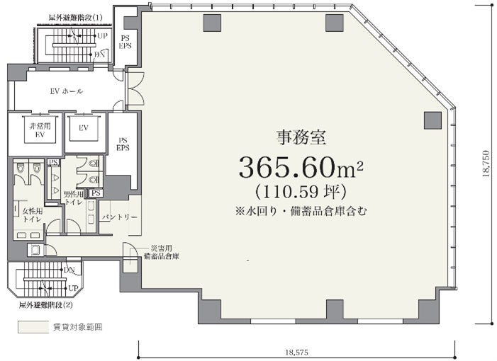 〇災害時、本線からの電力供給が寸断された場合、ビル内非常用電源によりテナント貸し室内に電力供給を行います。(15VA/㎡相当:最大24時間)