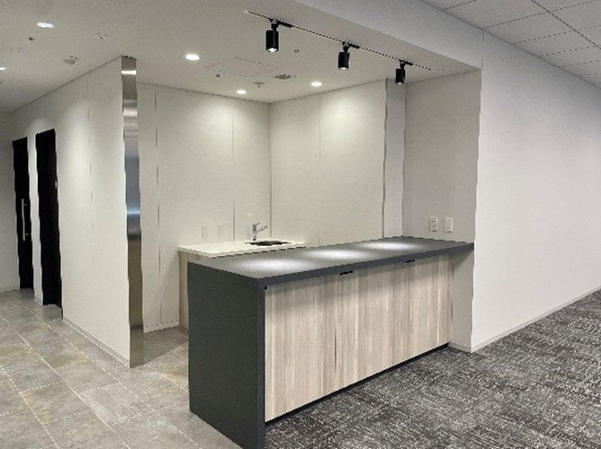 〇執務室内に設けたオープンパントリーは、ワーカー同士のコミュニケーションを促進させる空間を演出。