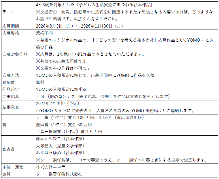 ソニー損害保険株式会社(代表取締役社長:鈴木 隆行、本社:東京都大田区、以下「ソニー損保」)は、株式会社ニコモ(代表取締役:犬養 岬太、本社:東京都文京区、以下「ニコモ」)が運営する「子どもの安全を考える絵本大賞 Sponsored by ソニー損保」に協賛しますので、お知らせします。絵本作品の応募期間は、2026年8月3日(月)から同年11月30日(月)までです。