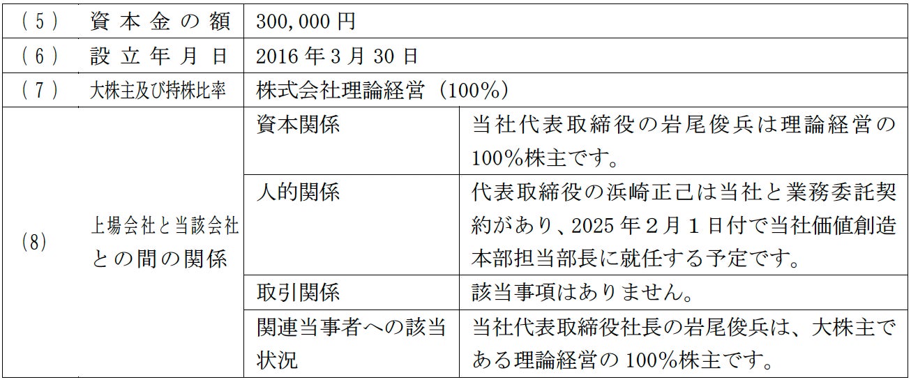 なお、当社代表取締役社長の岩尾俊兵は理論経営の全株式を保有しており、特別利害関係人に該当するため、本件の取締役会審議および決議には参加しておりません。