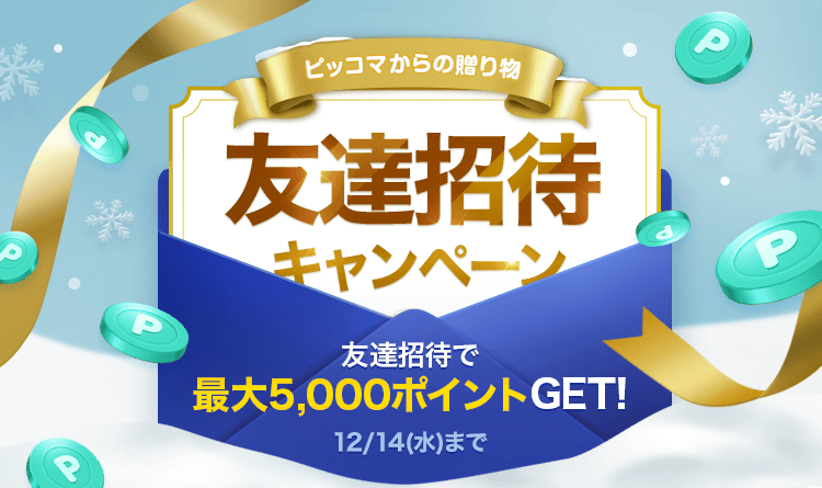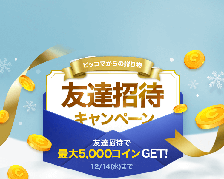概要:ピッコマに新規ユーザーを1人ご招待する度、500コイン/ポイントをプレゼントいたします。招待の上限は10回と、期間中最大5,000コイン/ポイントをゲットできるチャンスとなっております。またご招待された新規ユーザー(アプリ・ WEB)にも1,000コイン/ポイントをプレゼントいたします。