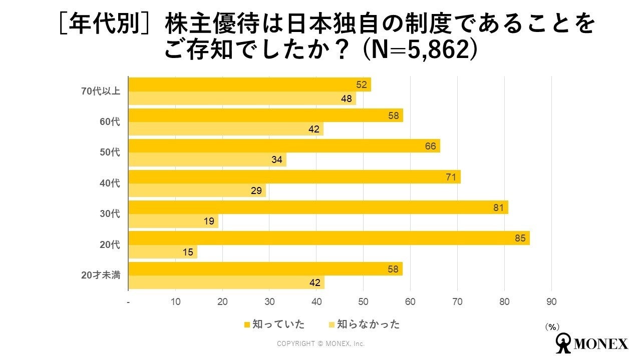・株主優待が日本独自の制度であることを知らなかった投資家が約4割。20~30代の認知は8割を超えているが、年齢が上がるほど認知が下がり、70代以上は約半数が日本独自の制度と知らず。(1-4、1-5)
