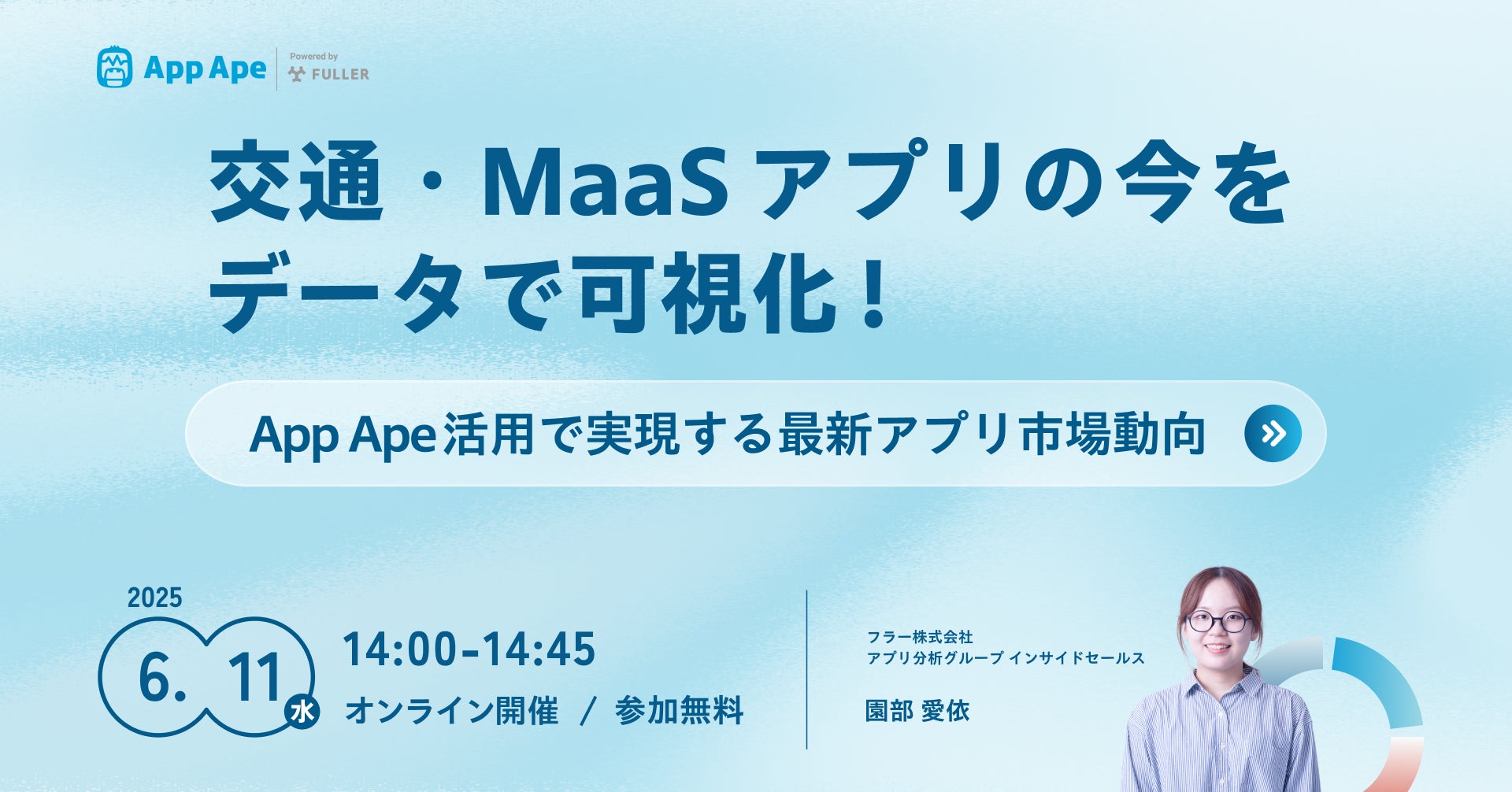 アプリ市場分析サービス「App Ape(アップ・エイプ)」を手がけるフラー株式会社(本社:新潟県新潟市、代表取締役社長:山﨑将司、以下「フラー」)は、交通・MaaSアプリの利用動向を多角的に解説するセミナーを2025年6月11日(水)に開催します。