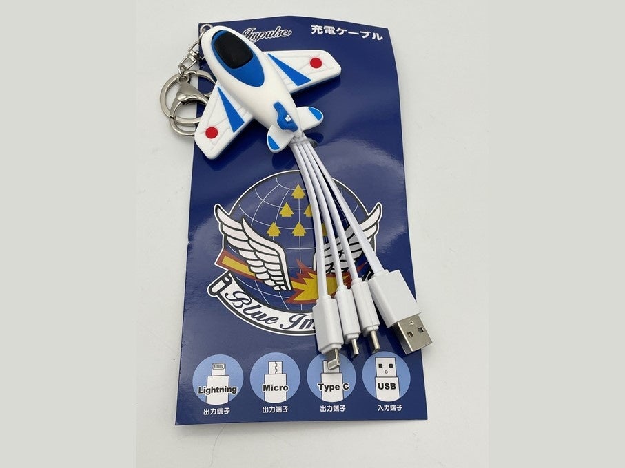 見た目がカッコイイだけじゃない!「Lightning」「micro」「Type-C」の出力端子3タイプと入力端子の「USB」が一つにまとまったブルーインパルス型の充電ケーブル。アクセサリーとしても持ち歩ける。