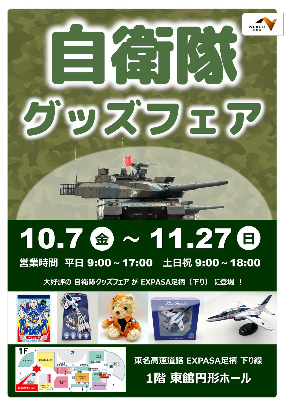 中日本エクシス株式会社 足柄支店 (静岡県駿東郡小山町、支店長・谷中(たになか)伸一(しんいち))は、E1 東名高速道路(東名) EXPASA(エクスパーサ)足柄(下り、静岡県駿東郡小山町)にて、「自衛隊グッズフェア」を期間限定で開催します。