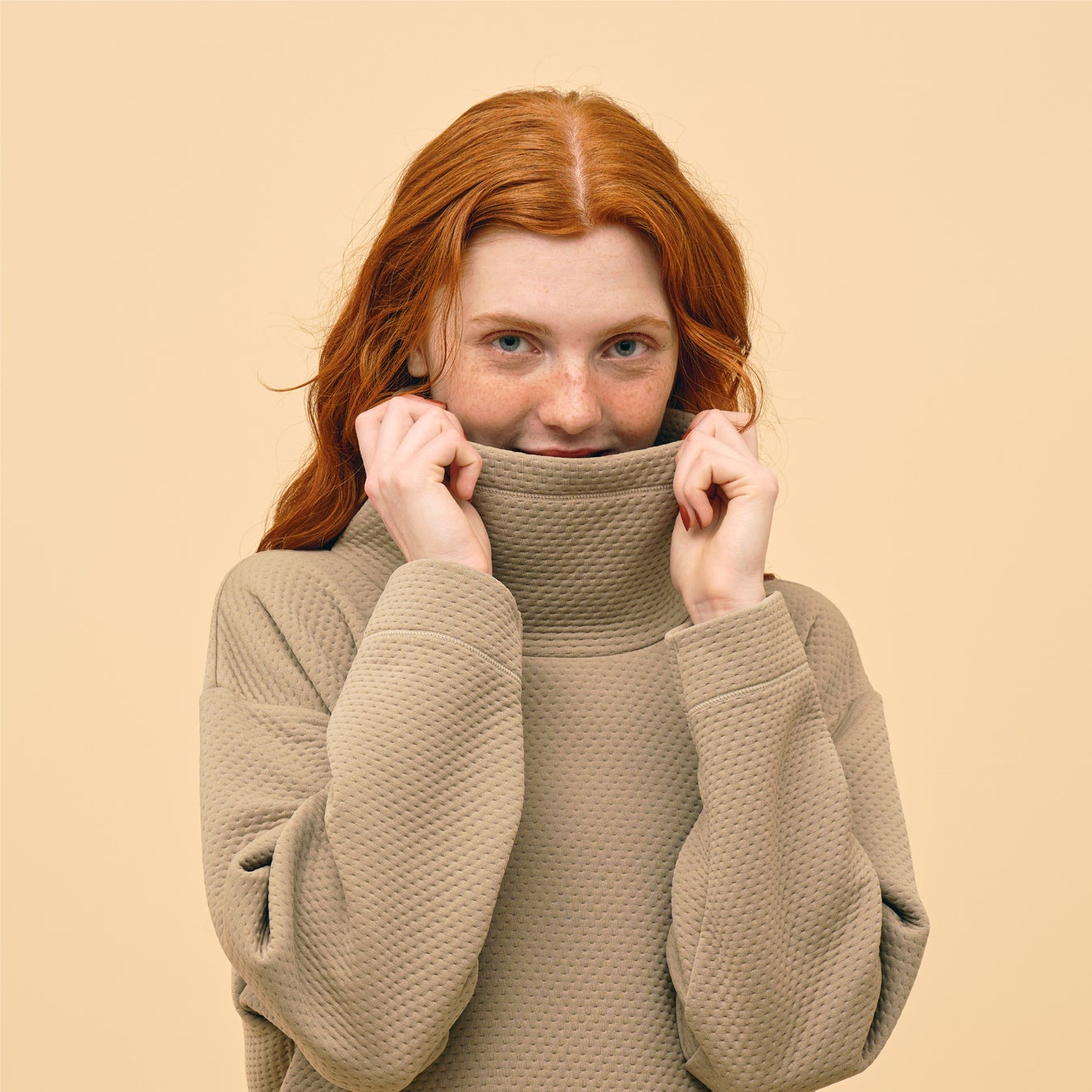 『リップルキルト』は、『ブレスサーモ』と袋編みの3層立体構造が生み出す保温素材です。表面は柔らかくしなやかで、スウェットのように編み目が詰まっているので風を通さず、体の熱を逃しにくい構造になっています。ゆとりのあるシルエットで中にインナーを着ても着ぶくれしにくく、リラックスして着用できます。首元はハイネック仕様で温かく、裾はラウンドしており、ワイドパンツやレギンスと合わせても着用できます。両サイドにはポケットもある為、小物を入れるのにも便利です。ポケットに付いたオリジナル刺繍ロゴがアクセントになっています。