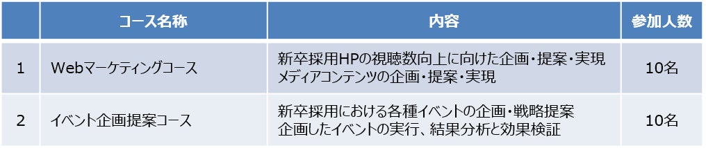当企画は就職に意欲的な学生を支援することを目的に、2016年より継続開催しております。本年度は、会社の人事・採用課題に対して若者視点で効果的な解決策を考え実行することをテーマに「Webマーケティング」と「イベント企画提案」の2つコースを設け、課題解決に取り組んでいただきました。