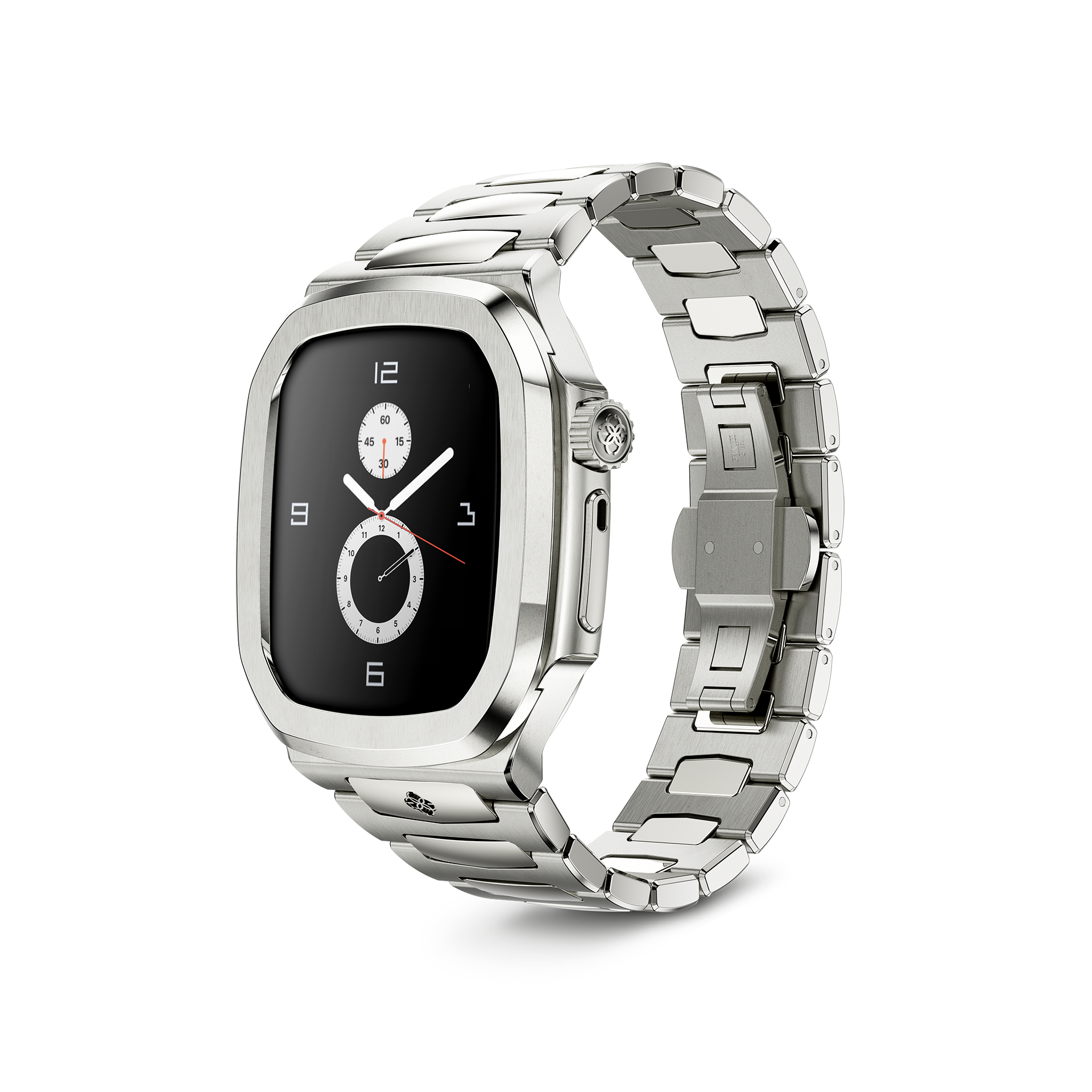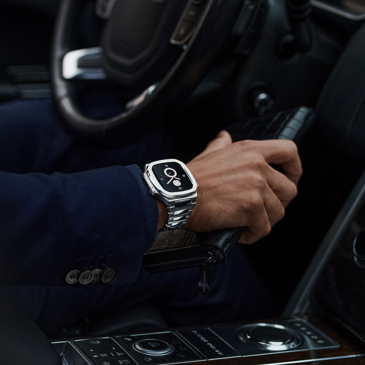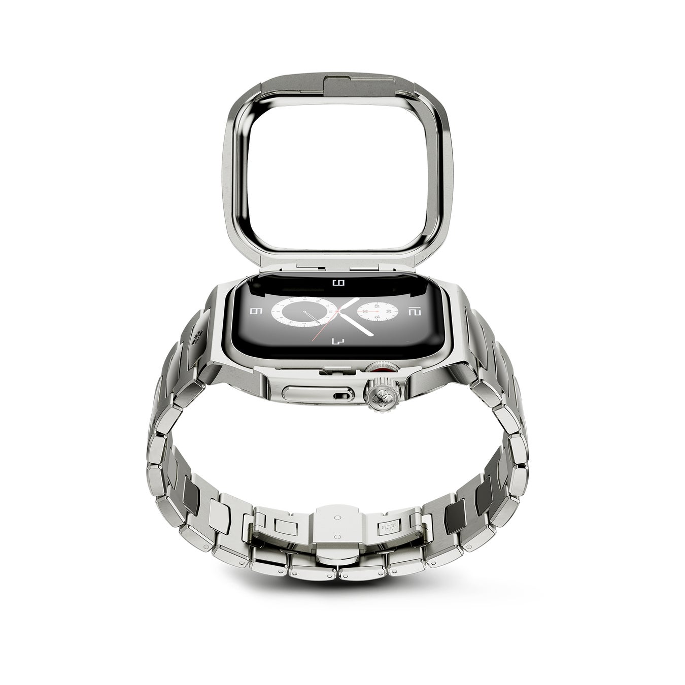 ゴールデンコンセプトのデザインチームは、最先端かつシンプルなケースを開発しました。これまで装着時に必要としてきた裏蓋のネジを不要とし、フロントベゼルには新たに「ハッチベゼル」を採用しました。これにより装着の際はサイドに付属のボタンを押すだけで、Apple Watchをケースに簡単に取り付け、取り外しすることを可能としました。