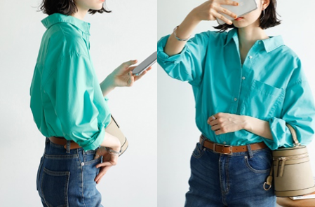 ■特長:程よいルーズシルエットで、リラックス感を演出するカラーシャツ。裾のヘムラインがアクセントをプラスします。トップスとしてだけでなく、軽めの羽織りとしても使える着回し力抜群の一着です。