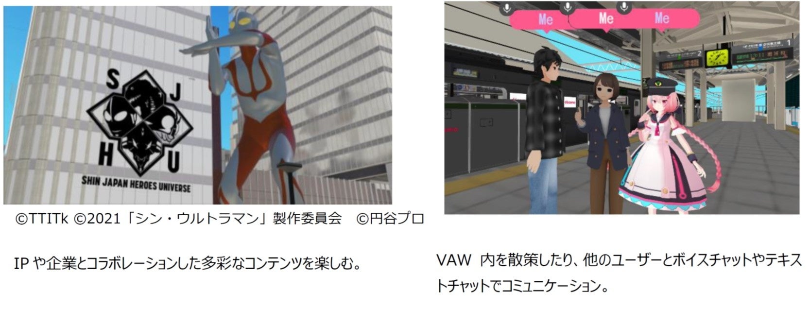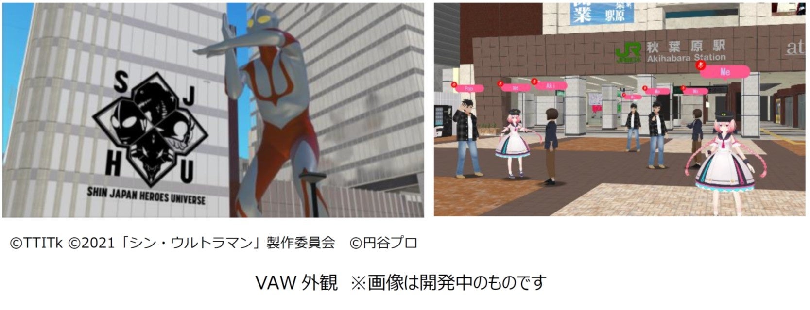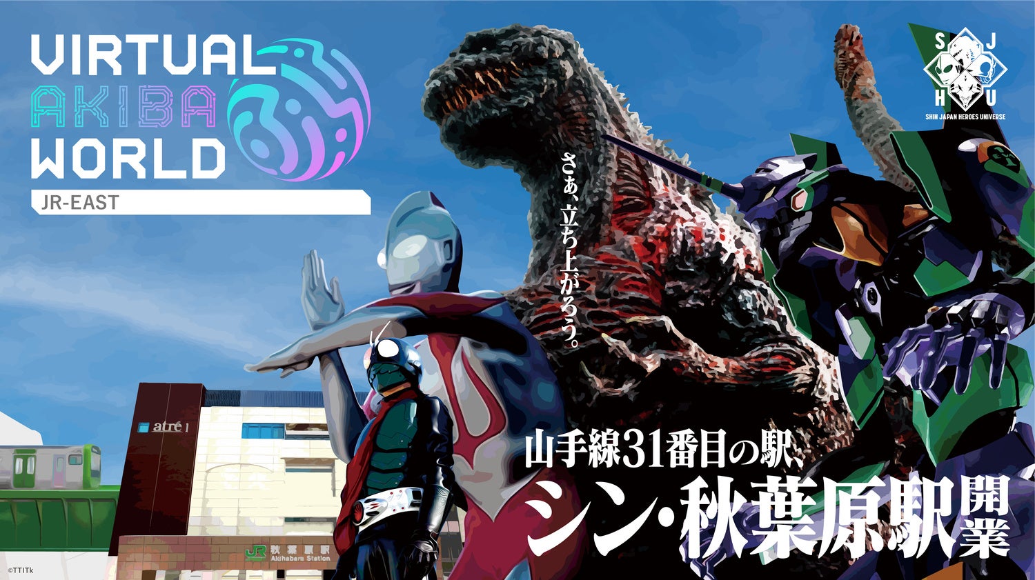 日本を代表する“ヒーロー”4作品によって構成された企画「シン・ジャパン・ヒーローズ・ユニバース」とコラボレーションし、コラボ期間中は「バーチャル秋葉原駅」を「シン・秋葉原駅」と名付けます。バーチャル空間にVAWオリジナルデザインのグラフィックと各キャラクターが登場し、来場者を出迎えます。
