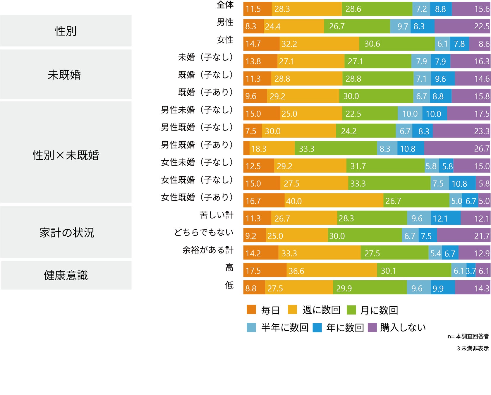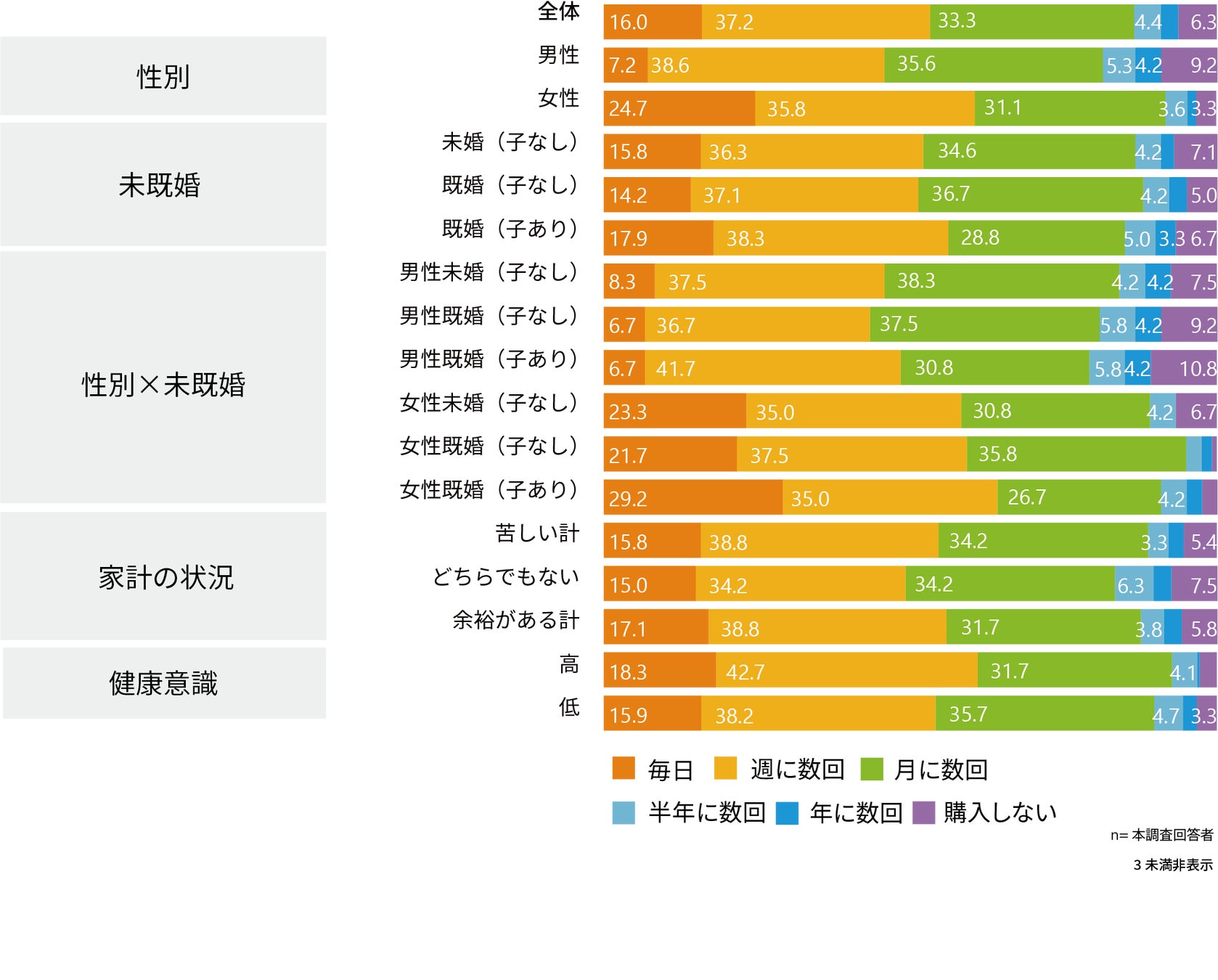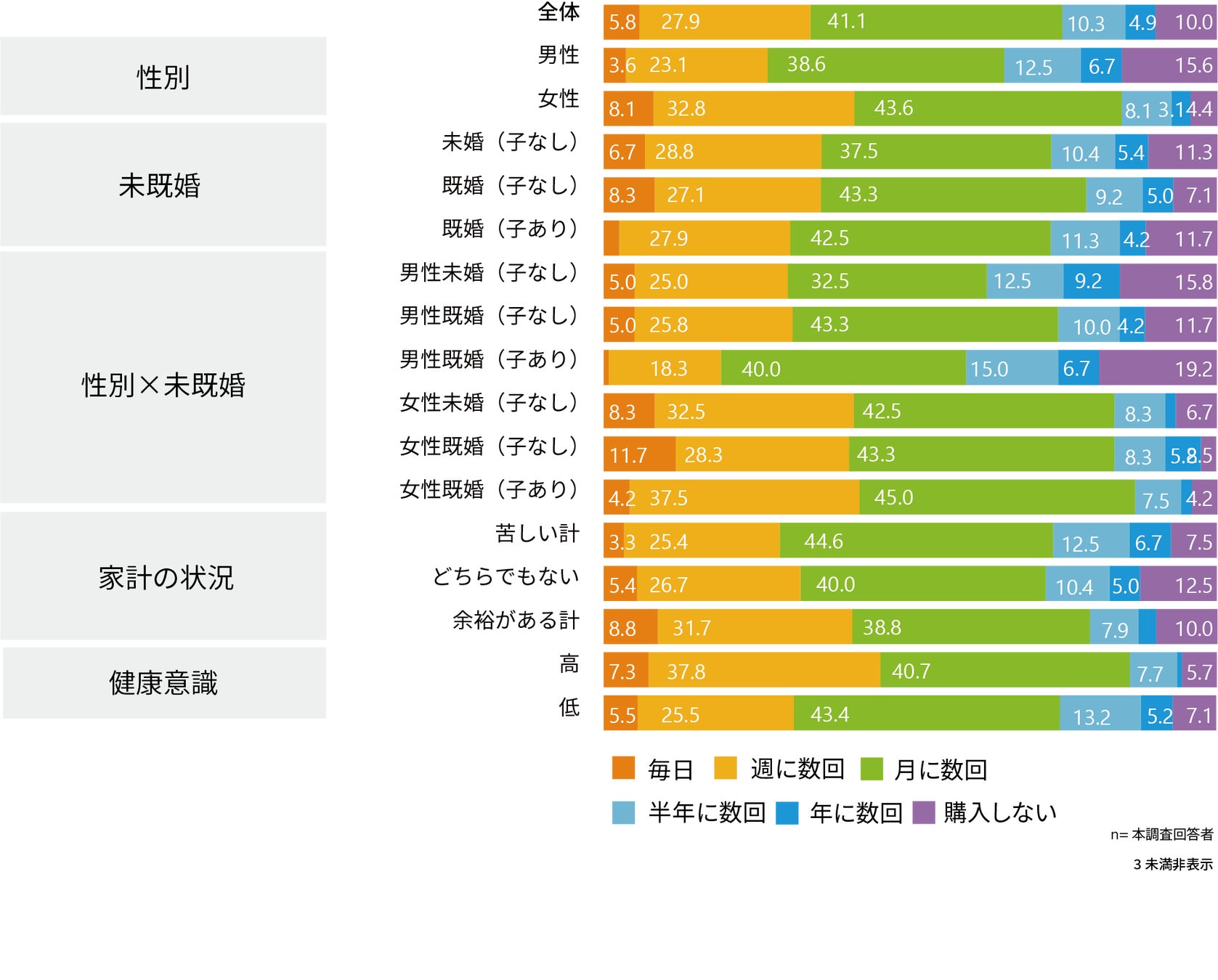 男性既婚(子あり)層の「購入しない」割合が他の層より高いのに対し、女性既婚(子あり)層は「週に数回」「毎日」購入する割合が他より高い。