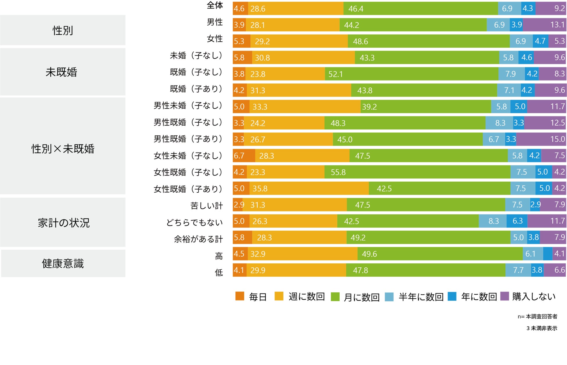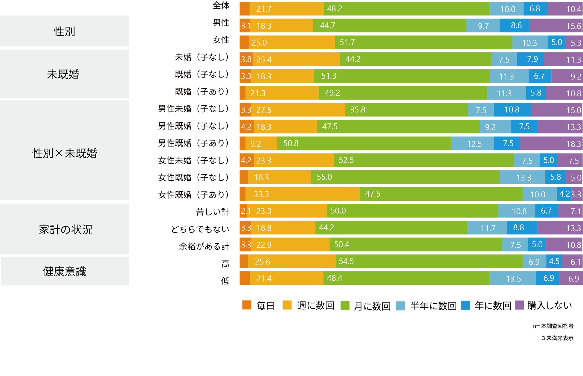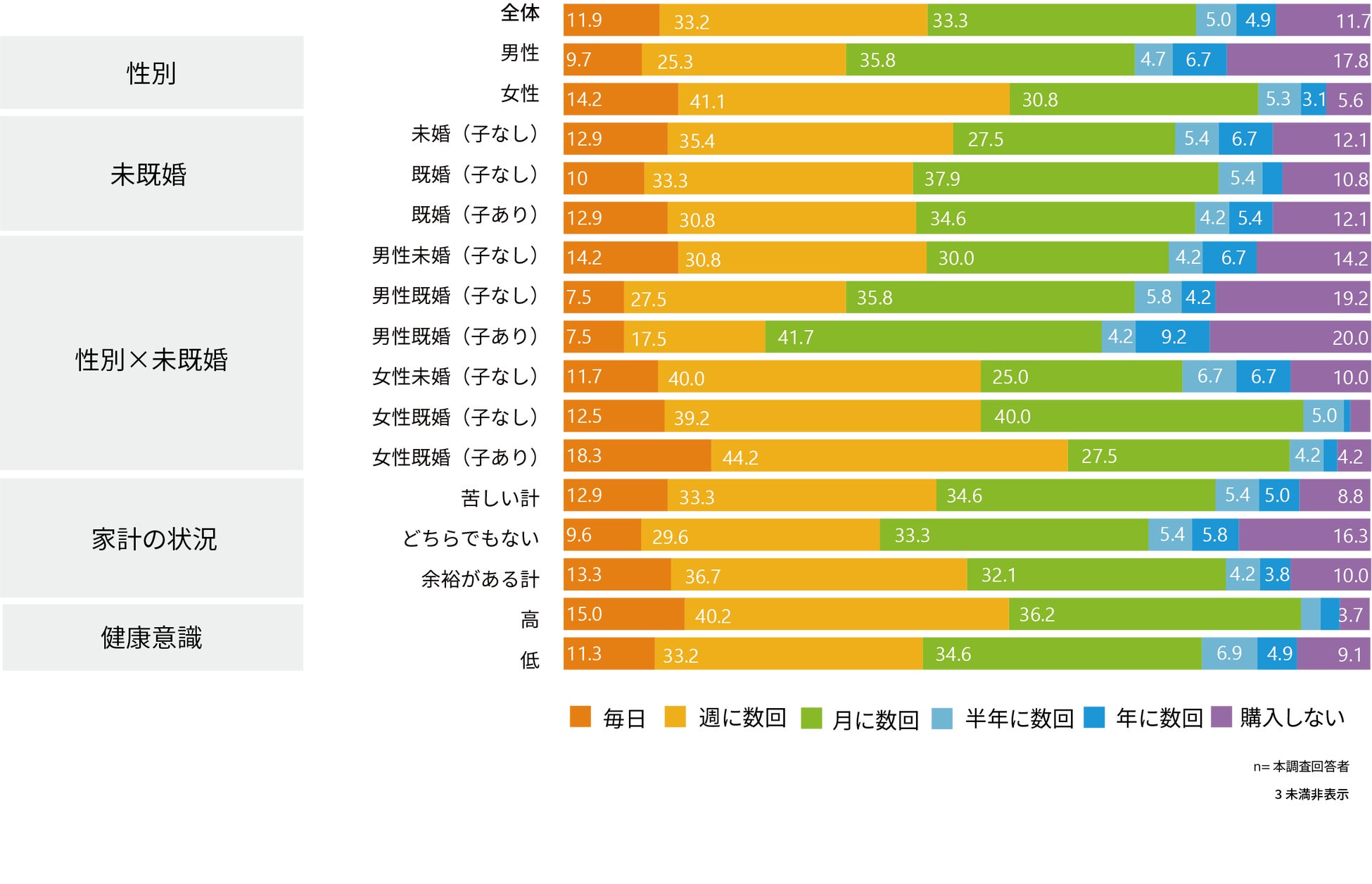 男性既婚(子あり)層の「購入しない」割合が他の層より高いのに対し、女性既婚(子あり)層は「週に数回」「毎日」購入する割合が他より高い。