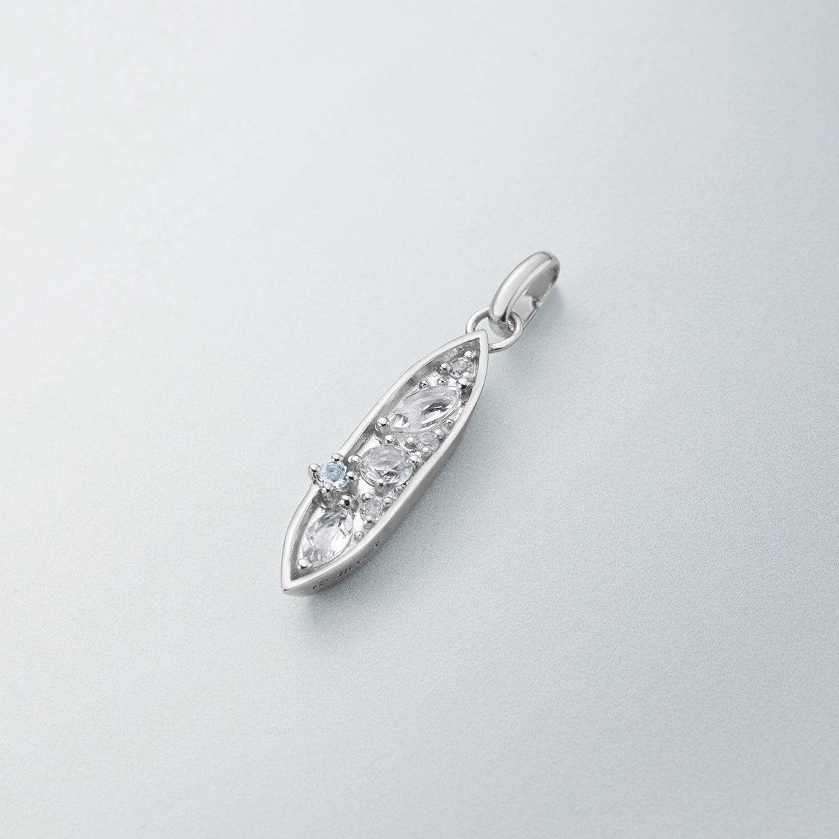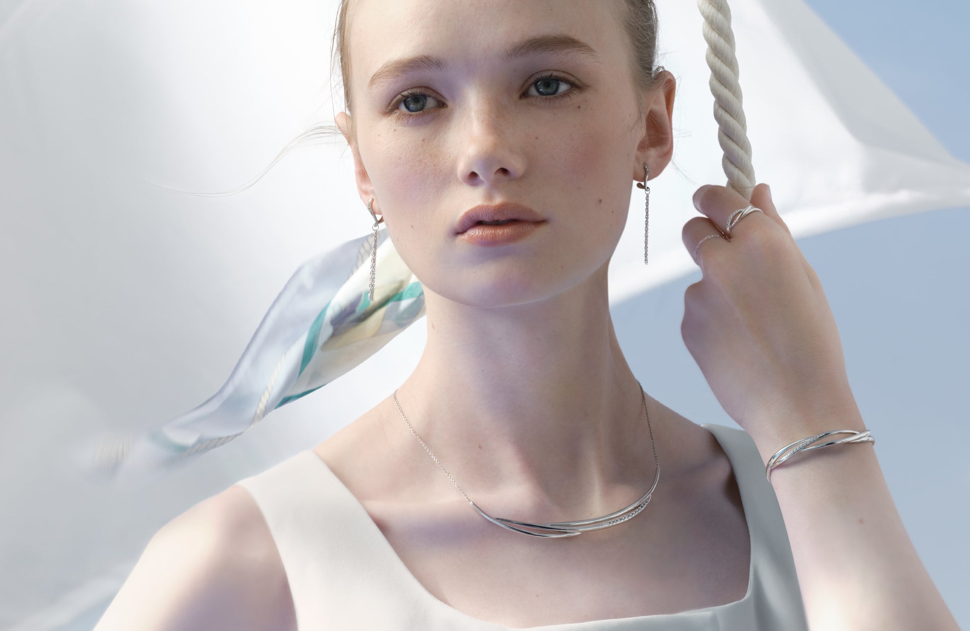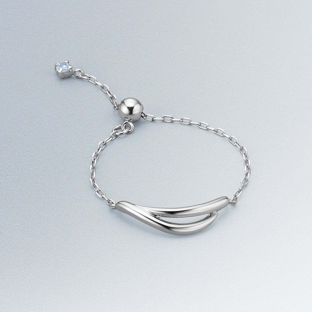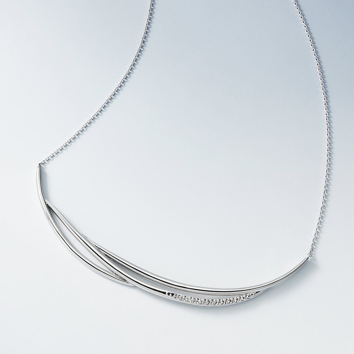 帆を張って進む船に吹き抜ける爽やかな風や、水面のきらめきをイメージしたボリューム感のあるシルバージュエリー。帆船が「順風満帆」や「困難を乗り越える」という意味を持つように、人生の飛躍を願う想いを込めたシリーズです。風の流れを思わせる立体的なラインで、軽やかな動きを表現しました。ネックレスは、ラインに沿ってセッティングされたトパーズが光を受けて繊細に輝き、水面のきらめきを思わせる透明感を添えます。さらに、2種類のチェーンを組み合わせたネックレスは、チャームを取り外して楽しめる2WAY仕様。装いに合わせてアレンジできるデザインです。リングやバングルは、流れるようなフォルムが手元に自然になじみ、シルバーならではの存在感を引き立てます。