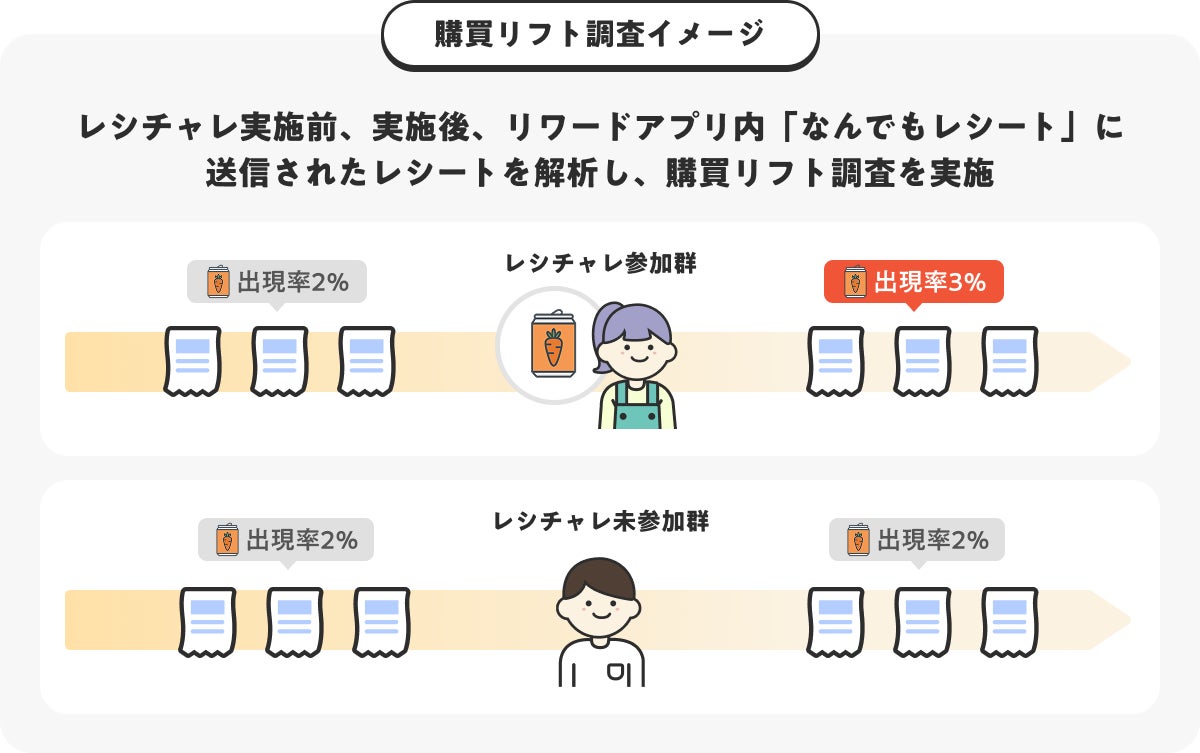 ユーザーが日常的にアップロードする全レシートをAIで解析する「なんでもレシート」を用い、施策掲載前後1ヶ月間の購買行動を比較検証いたしました。その結果、購買キャンペーンである「レシチャレ」のみを実施したユーザーの商品出現率が施策前比で44%増加したのに対し、調理体験を伴う「たべチャレ」に参加したユーザーの商品出現率は167%増加という大幅な伸びを記録いたしました。