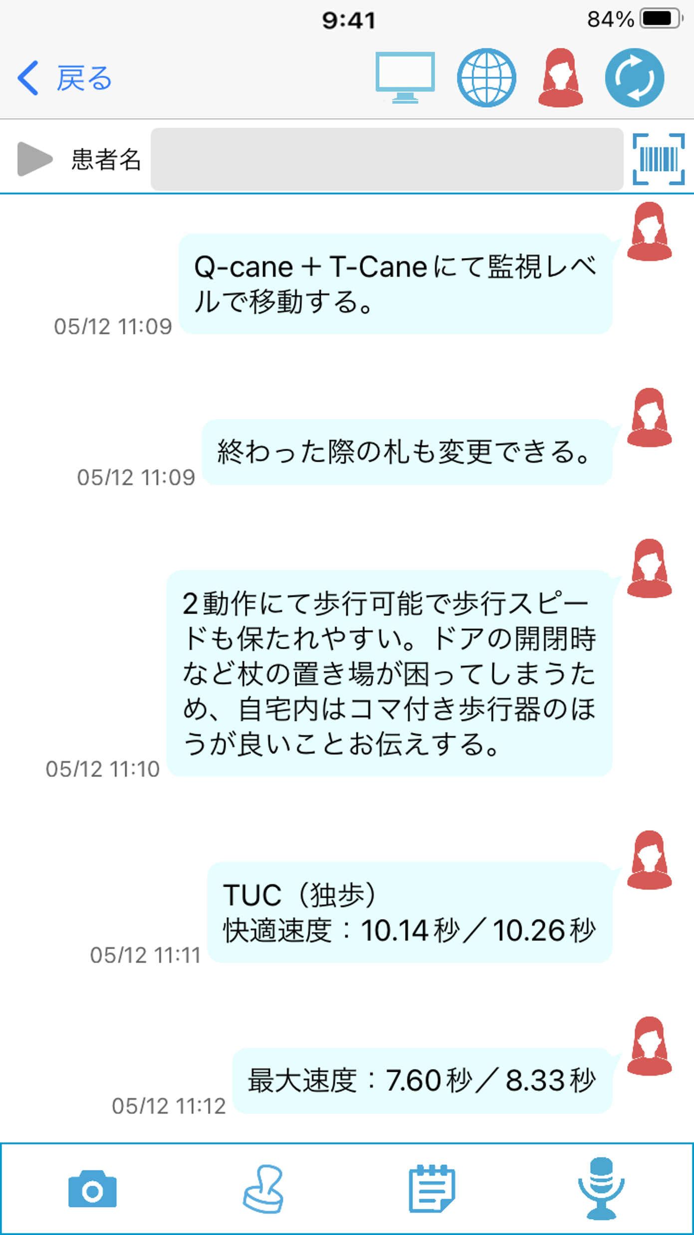 このほか、コロナ禍で面会制限がある中、患者のご家族に「AmiVoice iNote」に搭載されたカメラや動画機能でリハビリの様子を撮影し、日々の状況共有に活用することができました。さらに、入院時と退院前の様子を画像や動画でリハビリの効果測定を行い、患者自身がリハビリの進捗を客観的に確認できるほか、職員間で患者の状況を共有するうえでも役立ちました。