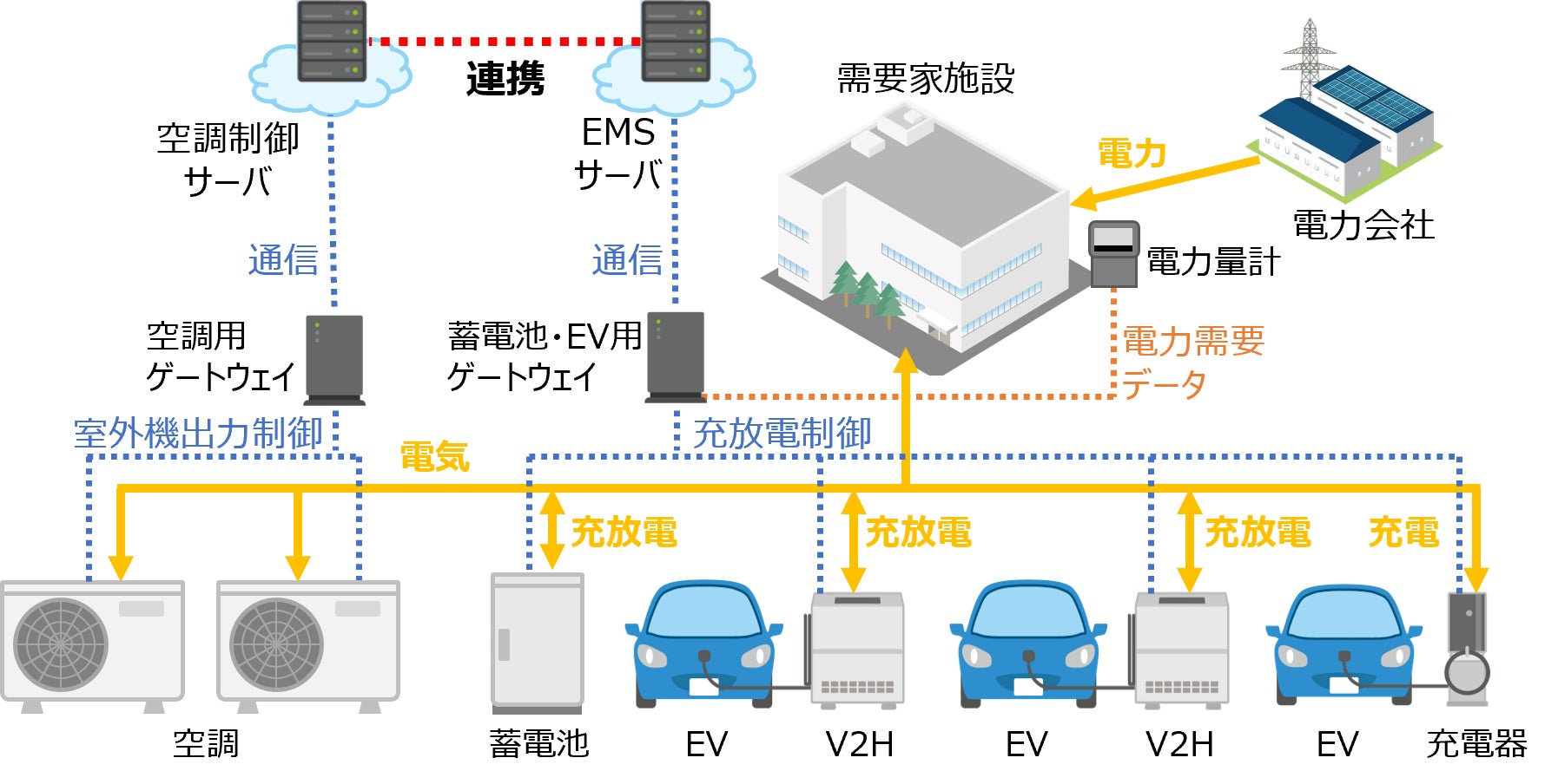 本実証実験では、2021年10月に当社、国富町、BIPROGY株式会社※、株式会社スマートドライブが発表した「宮崎県国富町役場でのエネルギーマネジメント実証実験の開始について」で開発したエネルギーマネジメントシステムで制御対象としていた蓄電池・EVに、新たに空調制御システムを追加して連携制御を行います。