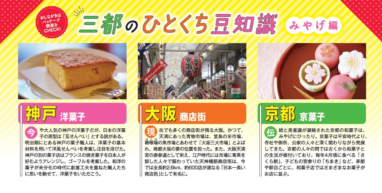 弁当には、るるぶ監修の「三都のひとくち豆知識」が同封されています。観光スポットやグルメ、お土産などの情報が添えられ、京阪神の魅力をさらに深く知ることができます。
