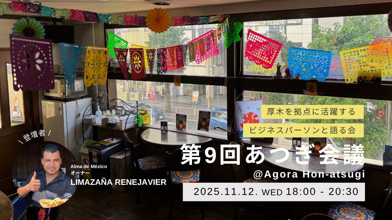 インキュベーションオフィス AGORA Hon-atsugi(以下、AGORA Hon-atsugi)にて、2022年10月より始まった、座談会形式のビジネスイベント「あつぎ会議」。このイベントは厚木を拠点に活躍するビジネスパーソンと語り合い、地域との交流機会を創出するという趣旨のイベントです。第9回は2025年11月12日(水)、本厚木で本場のメキシコ料理が食べられると評判の「Alma de México(アルマ デ メヒコ)」オーナー、JAVIER(ハビエル)氏をお呼びして、キッチンカーから始まった店舗実現までの起業ストーリーを伺います。