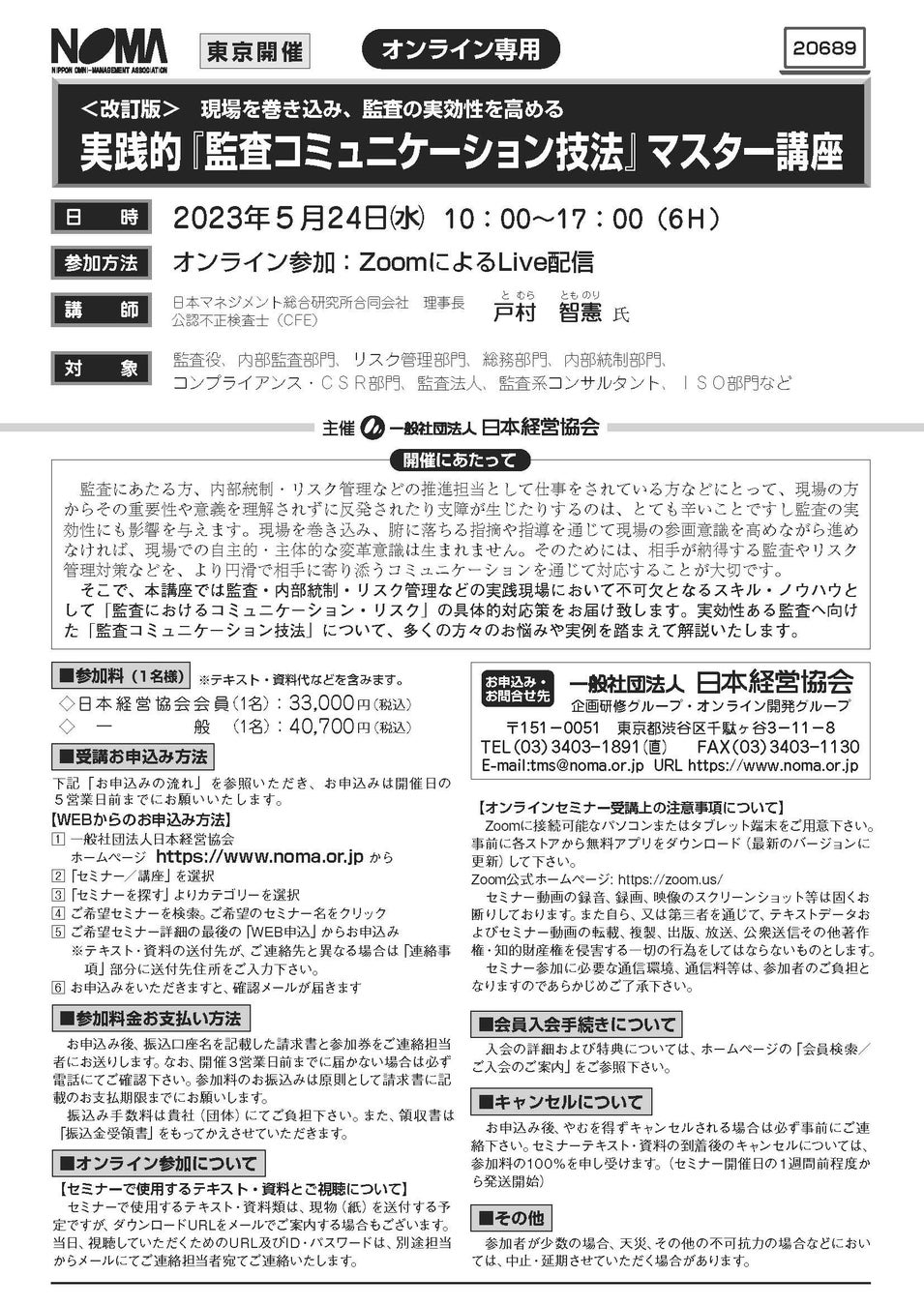 そこで、弊社理事長の戸村智憲が世界初で開発・ご提供して参りました十数年に渡り、バージョンアップや時事に即した内容をカバーしながらご提供しております「監査コミュニケーション講座」を、下記のとおり開催いたしますのでご案内申し上げます。