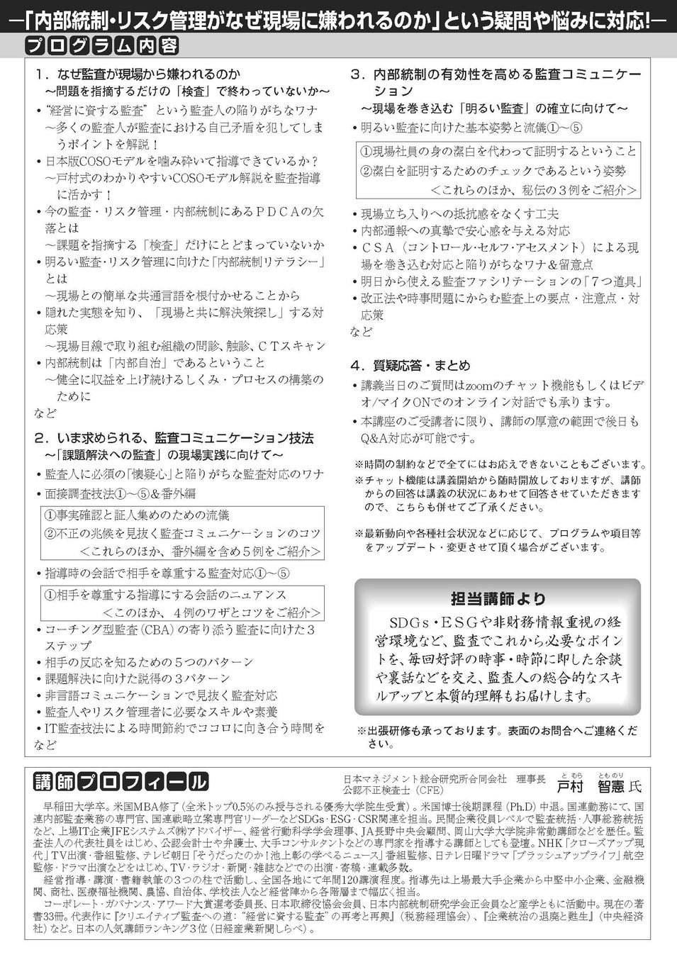 監査は意志次第・内部統制とはどう健全に生き働くか・ダイバーシティ対応を踏まえた監査対応などの講義内容が、民間企業・自治体・行政機関・学校法人・各種団体などにおかれまして、少しでもこの社会における羅針盤となりましたら幸いです。