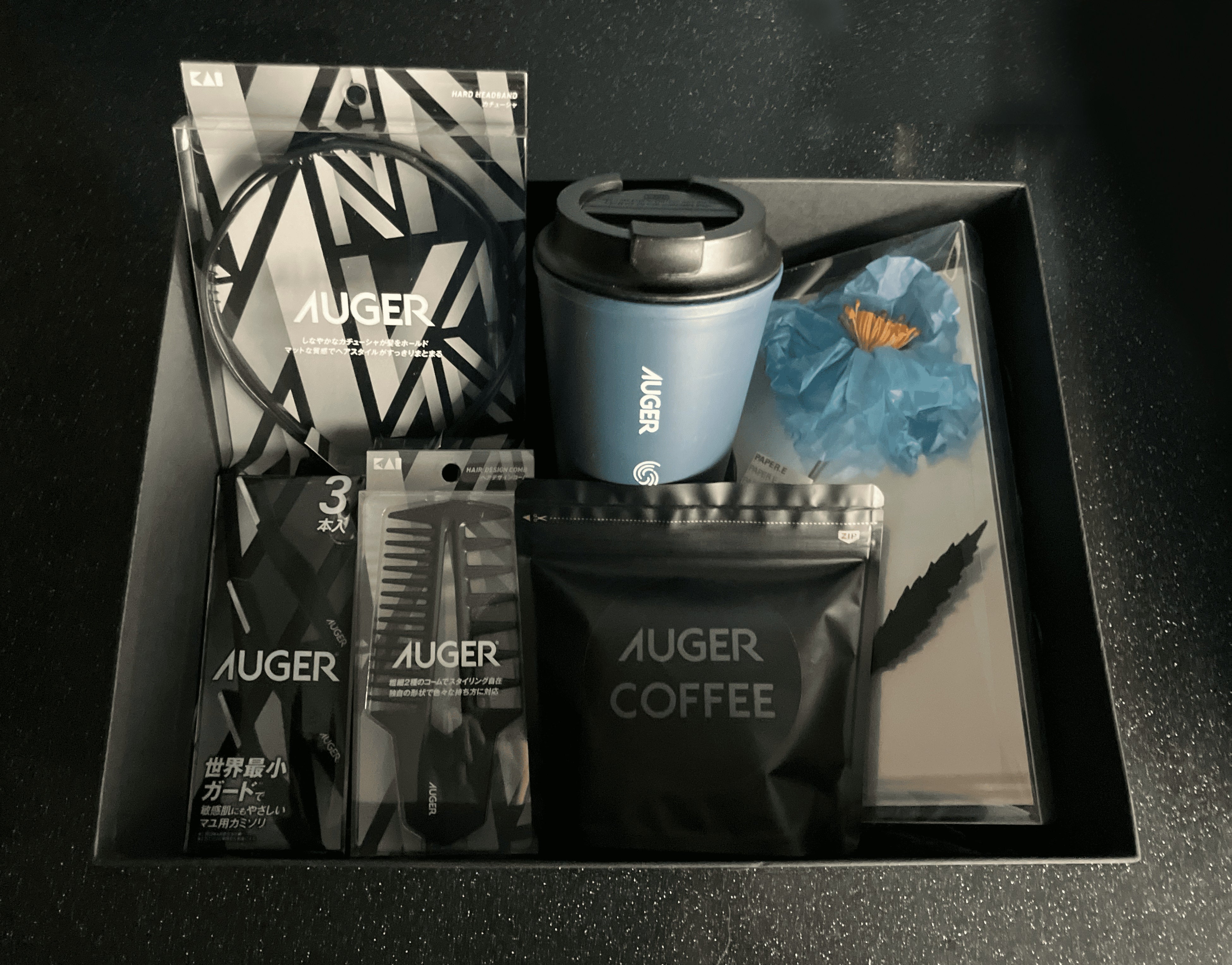 「AUGER」全商品のセット、限定タンブラーなどが入っているここでしか手に入れることができないスペシャルなBOXです。