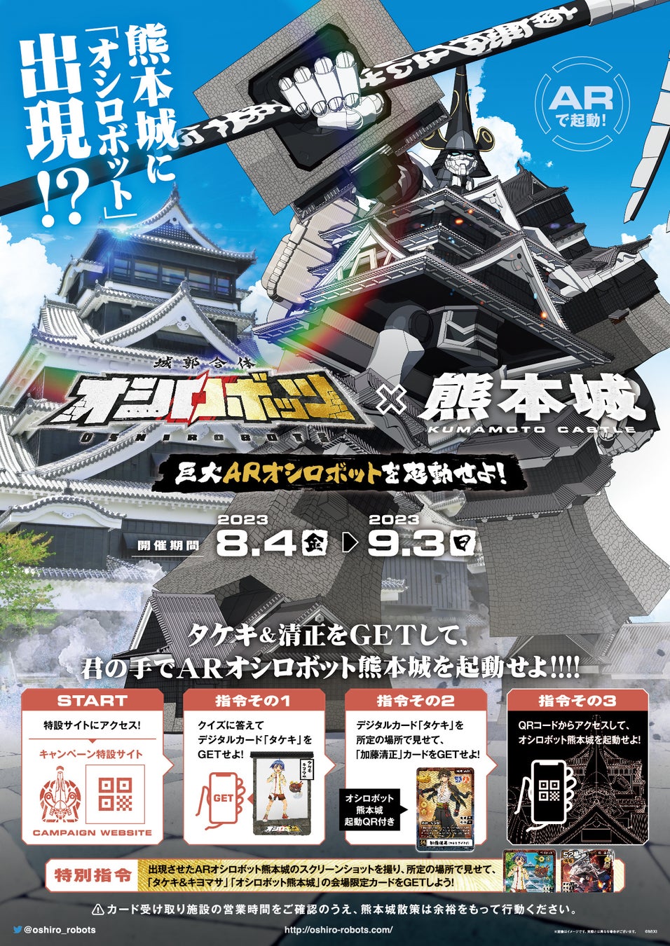 今回の連携協定を記念し、”ARオシロボット熊本城”出現を目指すイベント「オシロボッツ×熊本城:巨大ARオシロボットを起動せよ!」を8月4日(金)より開催します。熊本市内に貼りだされるポスター、チラシからキャンペーンサイトにアクセスすることで、イベントに無料で参加することができ、熊本城内での指令を達成された方にイベント限定トレーディングカードをプレゼントします。