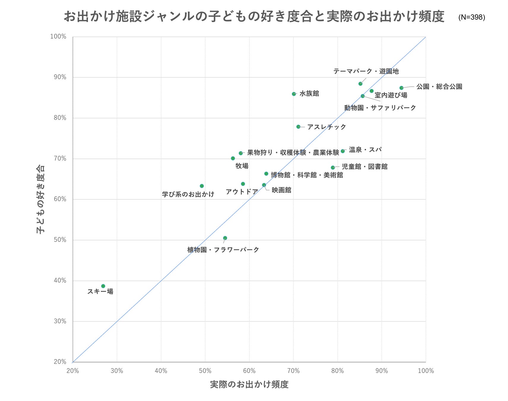 では、各施設において「子どもの好きの度合い」と「実際のお出かけ頻度」を比較して見てみましょう。