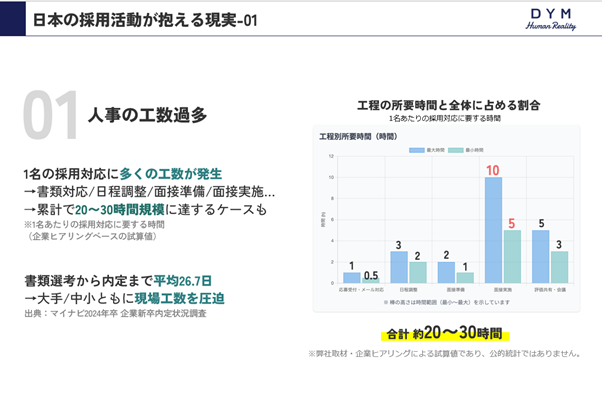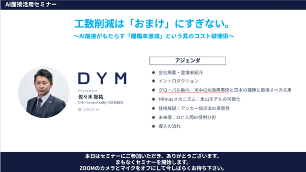 人材事業、WEB事業、海外医療事業などを中心に、M&A事業やスポーツ事業など多角的に事業を展開する株式会社DYM(読み:ディーワイエム、本社:東京都品川区、代表取締役社長:水谷佑毅)は、2026年2月18日(水)および2月25日(水)の2日程で、グループ会社である株式会社DYM HumanReality主催の「AI面接でコスト激減 判断を支える技術で挑む、次世代採用セミナー」をオンラインにて開催しました。