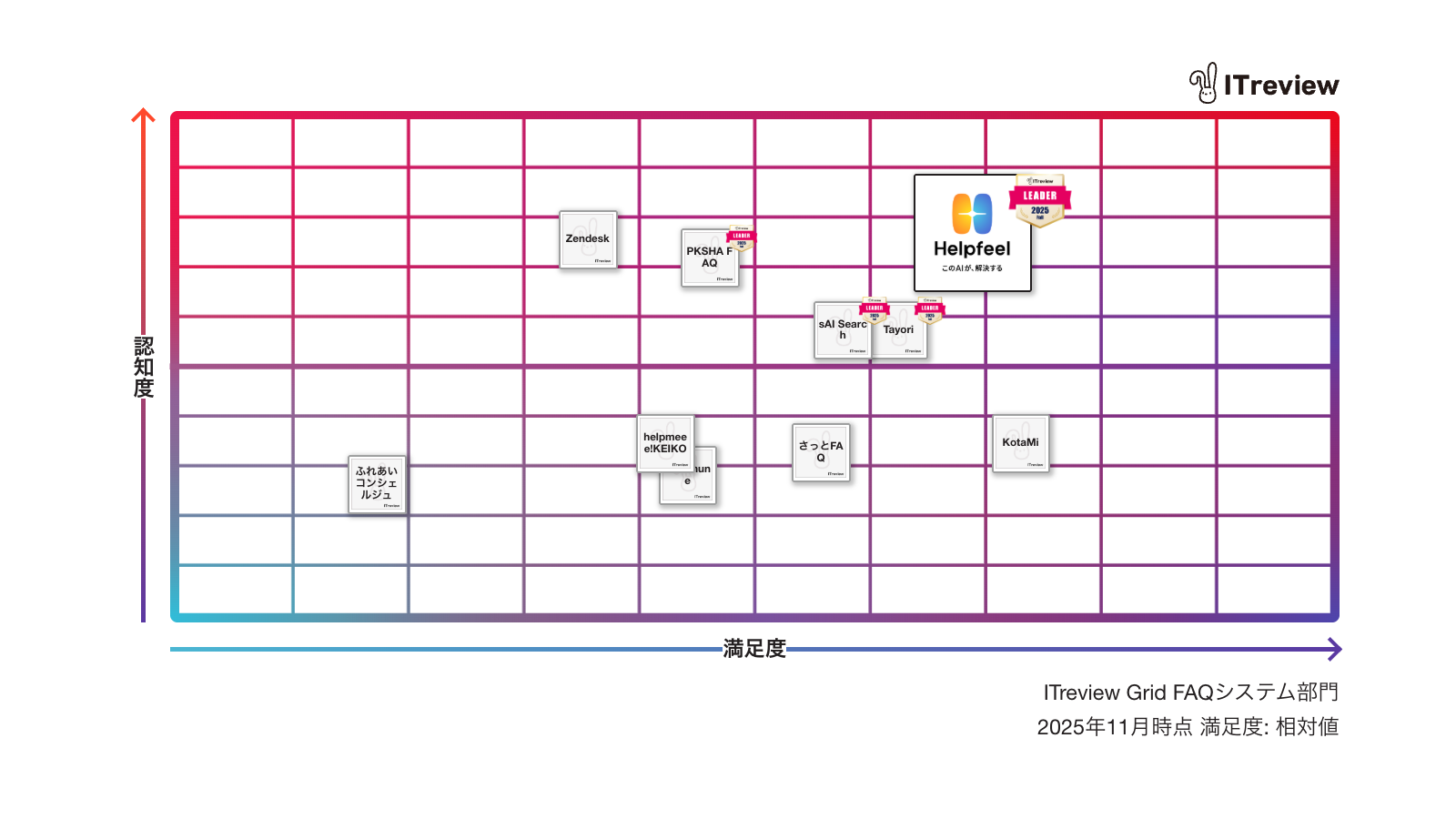 企業のAIを強くする「AIナレッジデータプラットフォーム」を提供する株式会社Helpfeel(京都府京都市、代表取締役/CEO:洛西 一周、以下「当社」)は、AI検索型FAQ「Helpfeel(ヘルプフィール)」が国内最大級のIT製品・SaaSレビューサイト「ITreview」で発表された「ITreview Grid Award 2025 Fall」において、ユーザーから認知度・満足度共に優れた製品であると評価され、「FAQシステム部門」で最高位にあたる「Leader」を受賞したことをお知らせいたします。本アワードの受賞は四期連続となります。