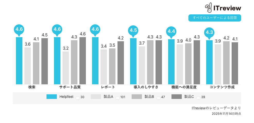 Helpfeelはユーザーレビュー件数30件、顧客満足度4.5と高いスコアを獲得しています(2025年11月19日時点)。