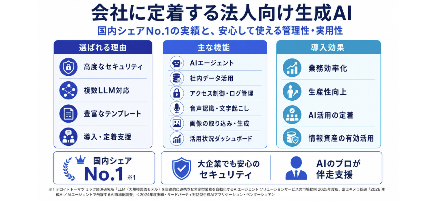 *1 富士キメラ総研「2026 生成AI/AIエージェントで飛躍するAI市場総調査」<2024年度実績・サードパーティ対話型生成AIアプリケーション・ベンダーシェア> https://www.fcr.co.jp/report/253q09a.htm