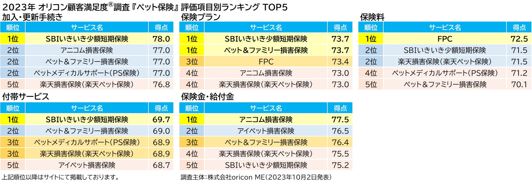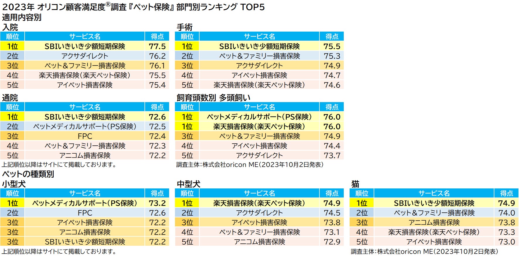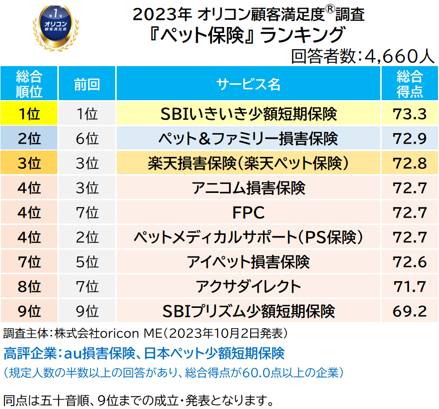 2023年 満足度の高い『ペット保険』ランキング |【SBIいきいき少額短期保険】が2年連続の総合1位に ~「入院」「手術」「通院」部門で2年連続、「猫」部門で初の1位に~(オリコン顧客満足度調査)
